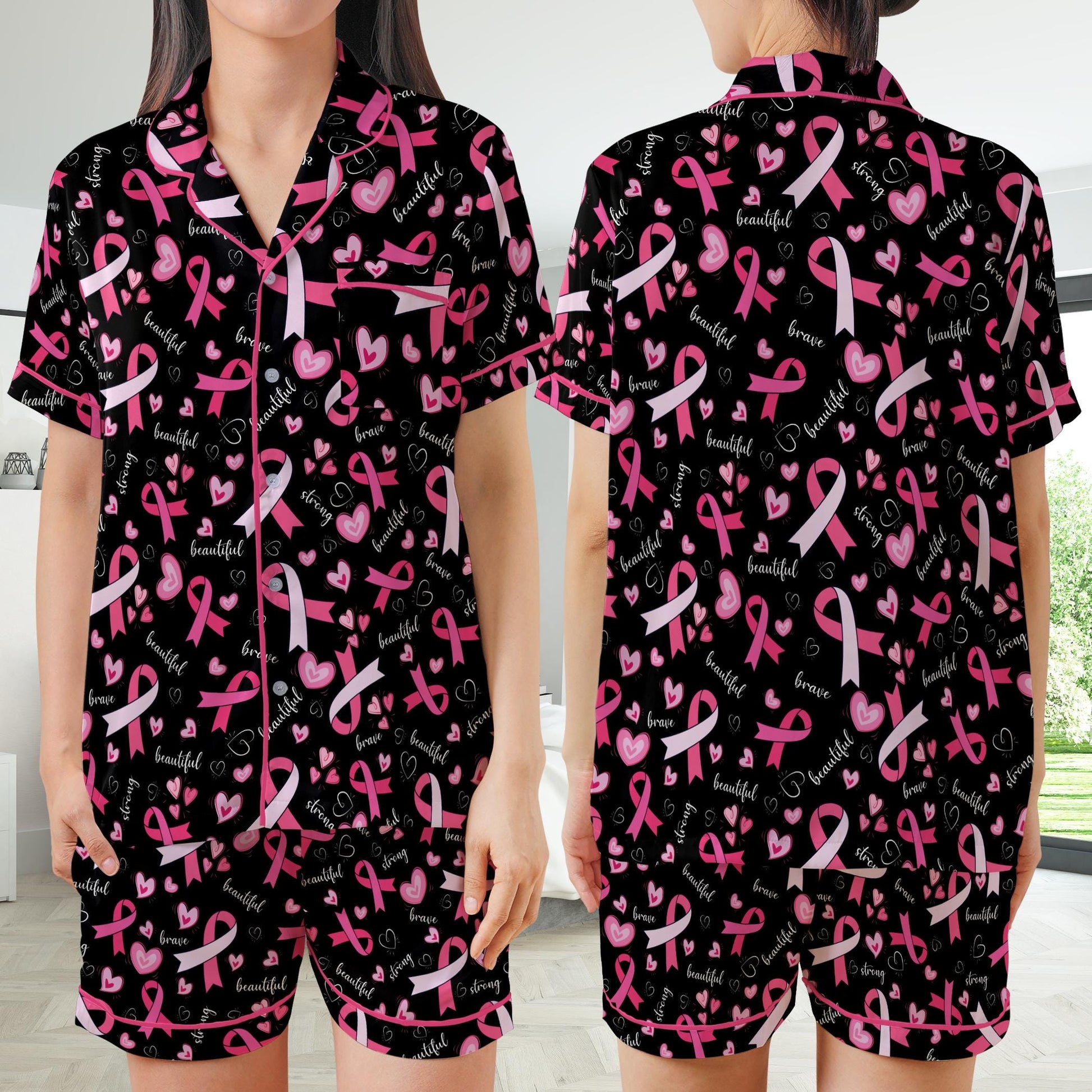 Pink Ribbon Satin Pajamas Set, Wear Pink In October Pajama Set, Breast Cancer Awareness Sleepwear Floral Breast Cancer Support Pajamas Gift