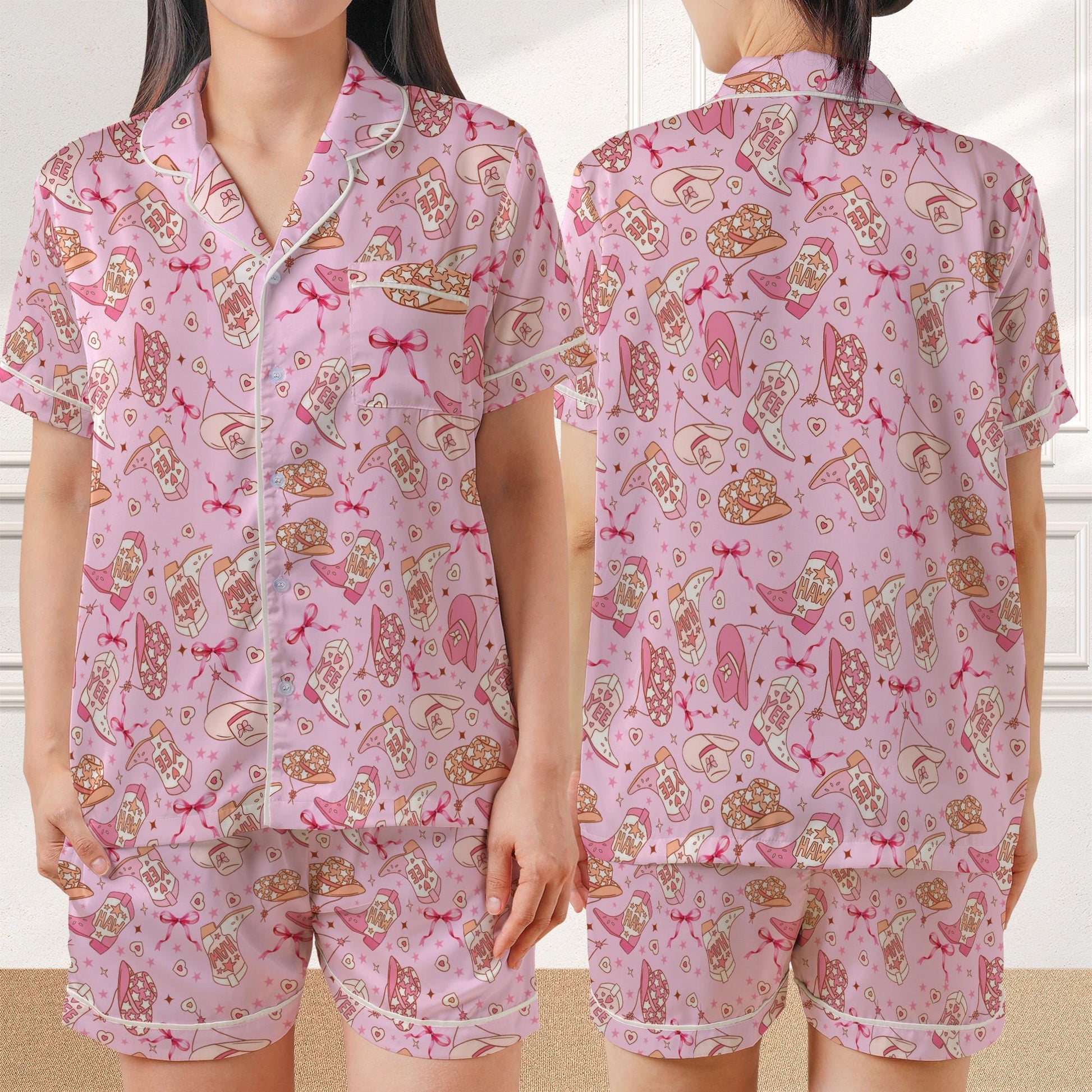 Pink Yee Haw Western Cowgirl Pajama Set, Coquette Cowgirl Sleepwear, Girly Western Loungewear Set, Pink Cowgirl Pjs, Cowgirl Hats & Boots