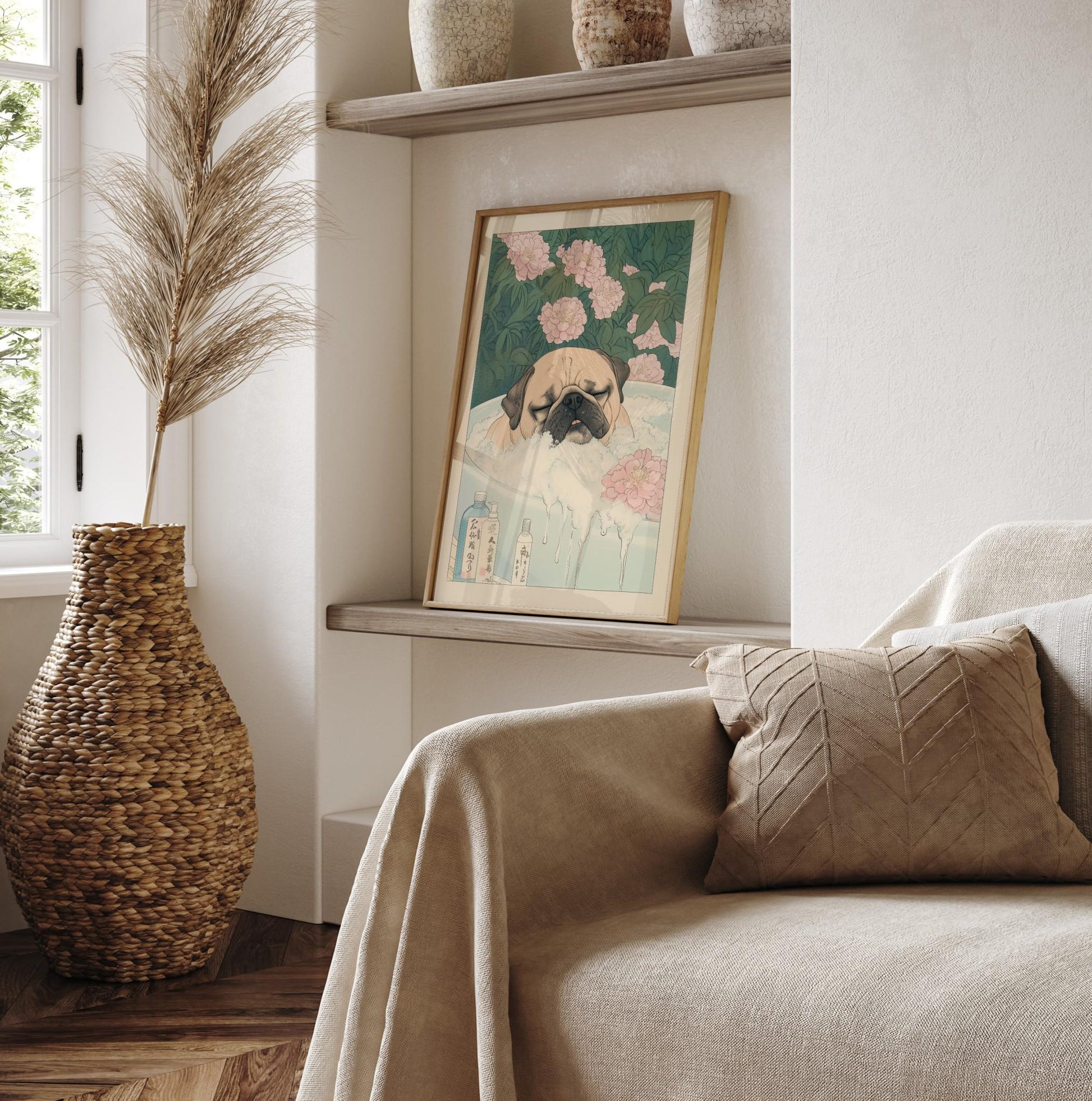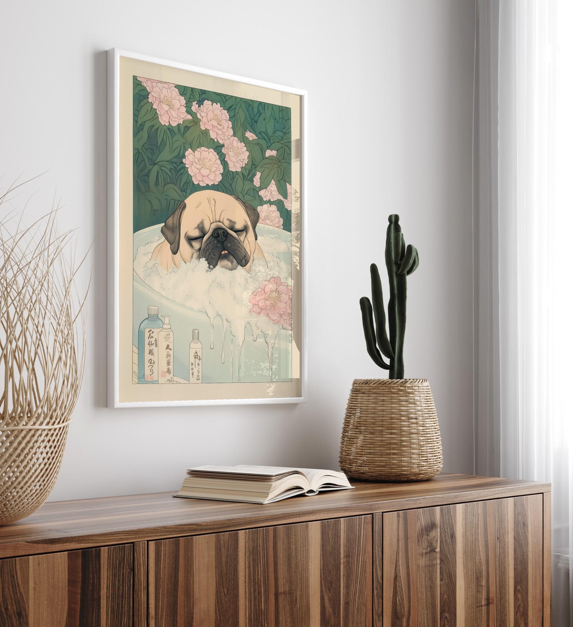 Pug Bathroom Print: Kawaii Japandi Ukiyo-e Dog Art