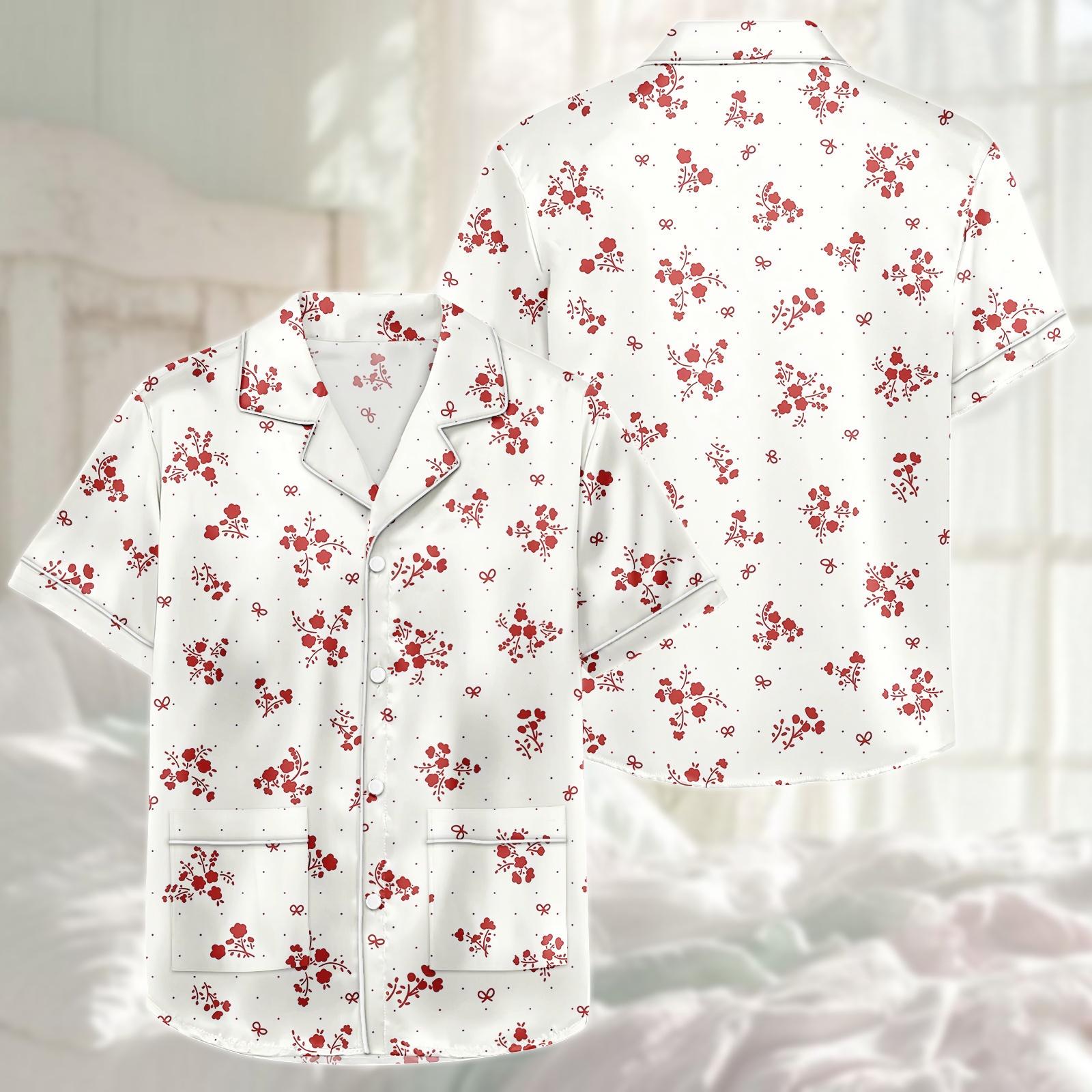 Red Floral Satin Pajama Short Set, Summer Sleeve Pjs For Women, White Elegant Sleepwear, Cute Satin Loungewear Pjs, Gift For Her