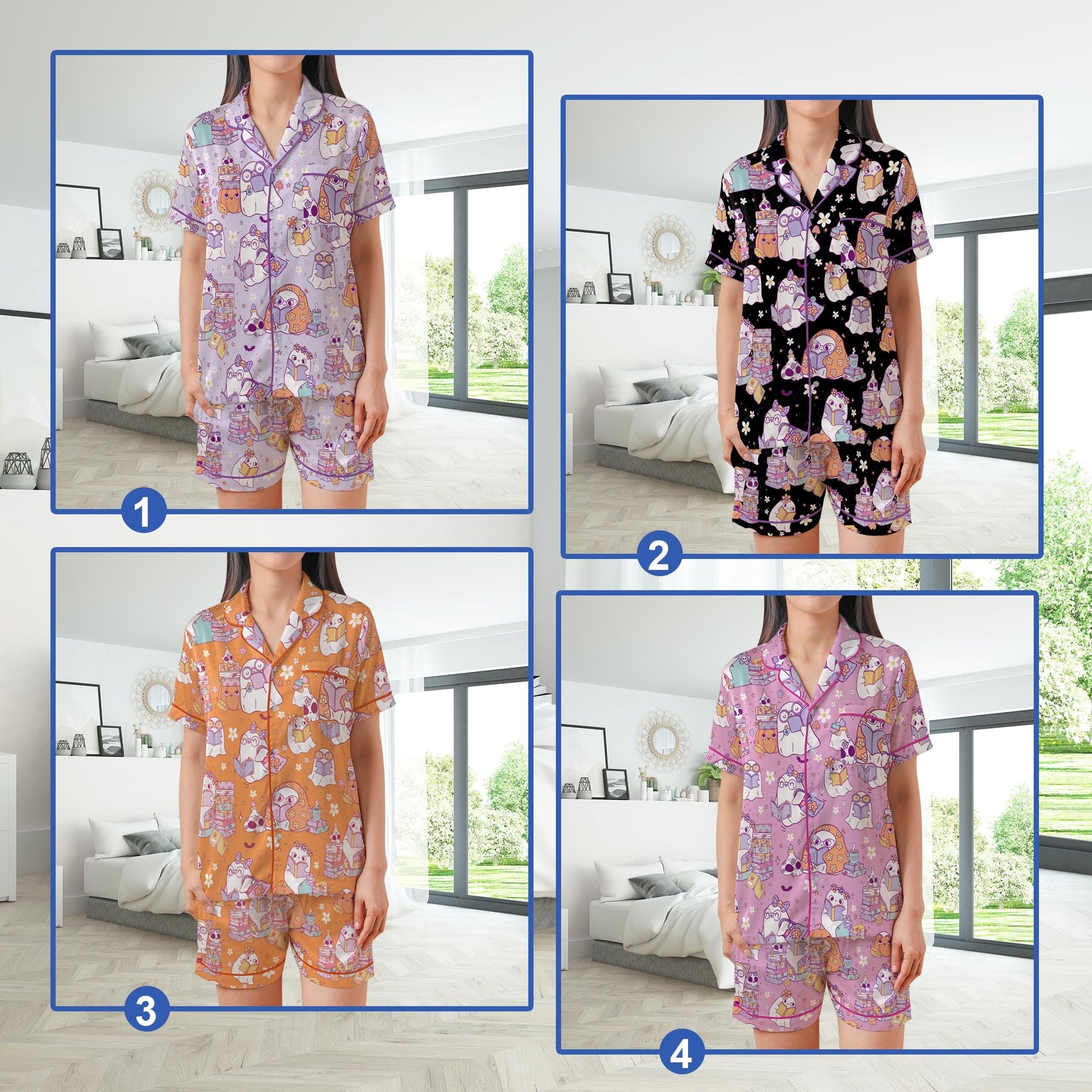 Retro Bookish Halloween Satin Pajamas Set, Cute Boo Reading Short Long Sleeve Pajama Set, Bookworm Sleepwear, Librarian Halloween Pajamas