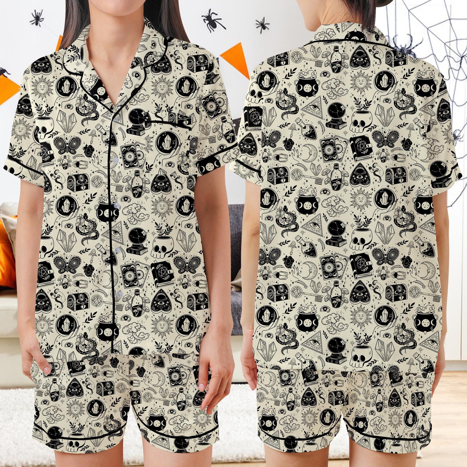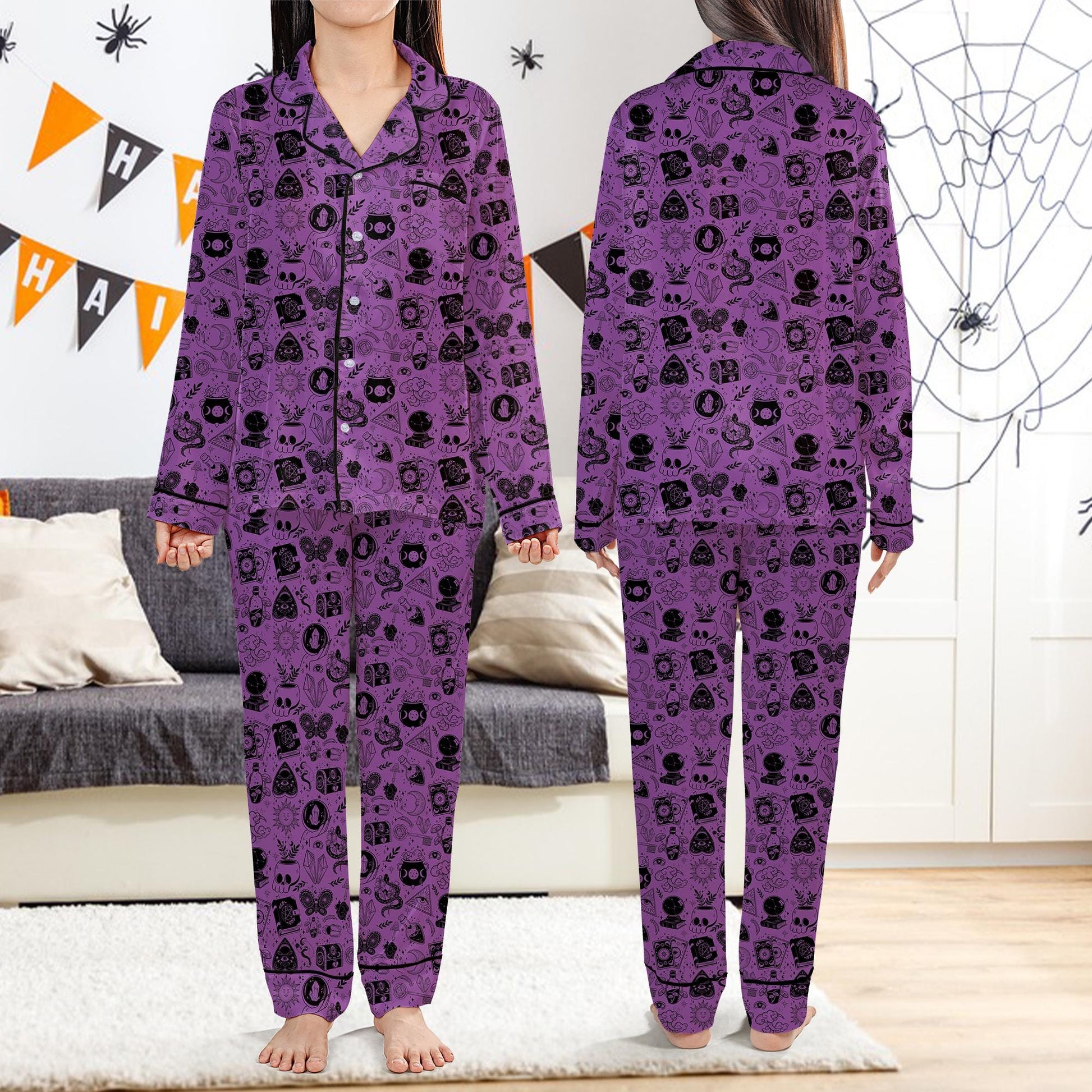 Retro Witch Vibes Halloween Satin Pajamas Set, Spooky Season Sleeve Pajama Set, Gothic Halloween Sleepwear, Celestial Halloween Pajamas