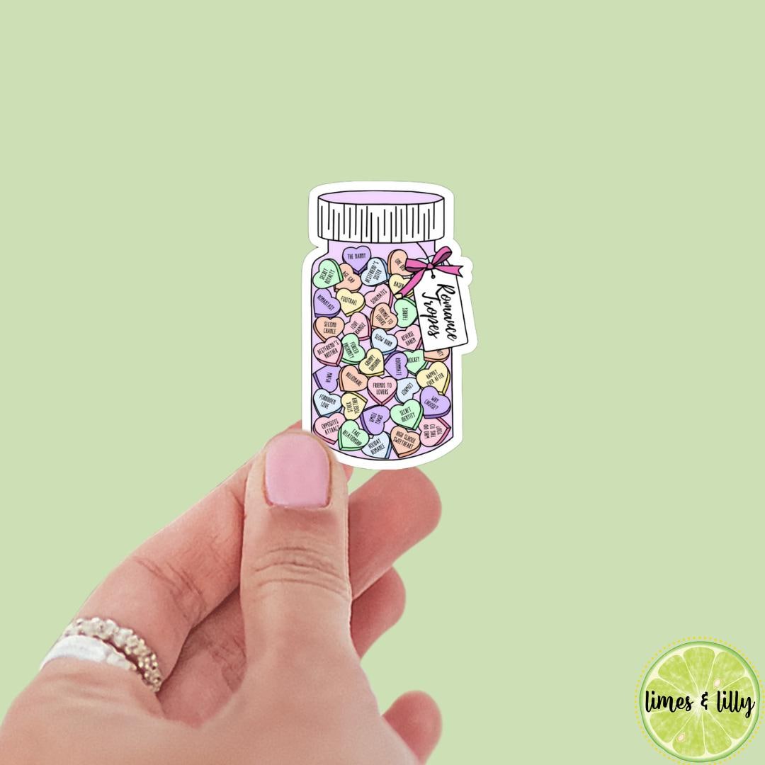 Romance Tropes Candy Hearts in Bottle Vinyl Sticker | Valentine’s Day Sticker | Valentine Sticker | Kindle Stickers | Bookish Stickers |