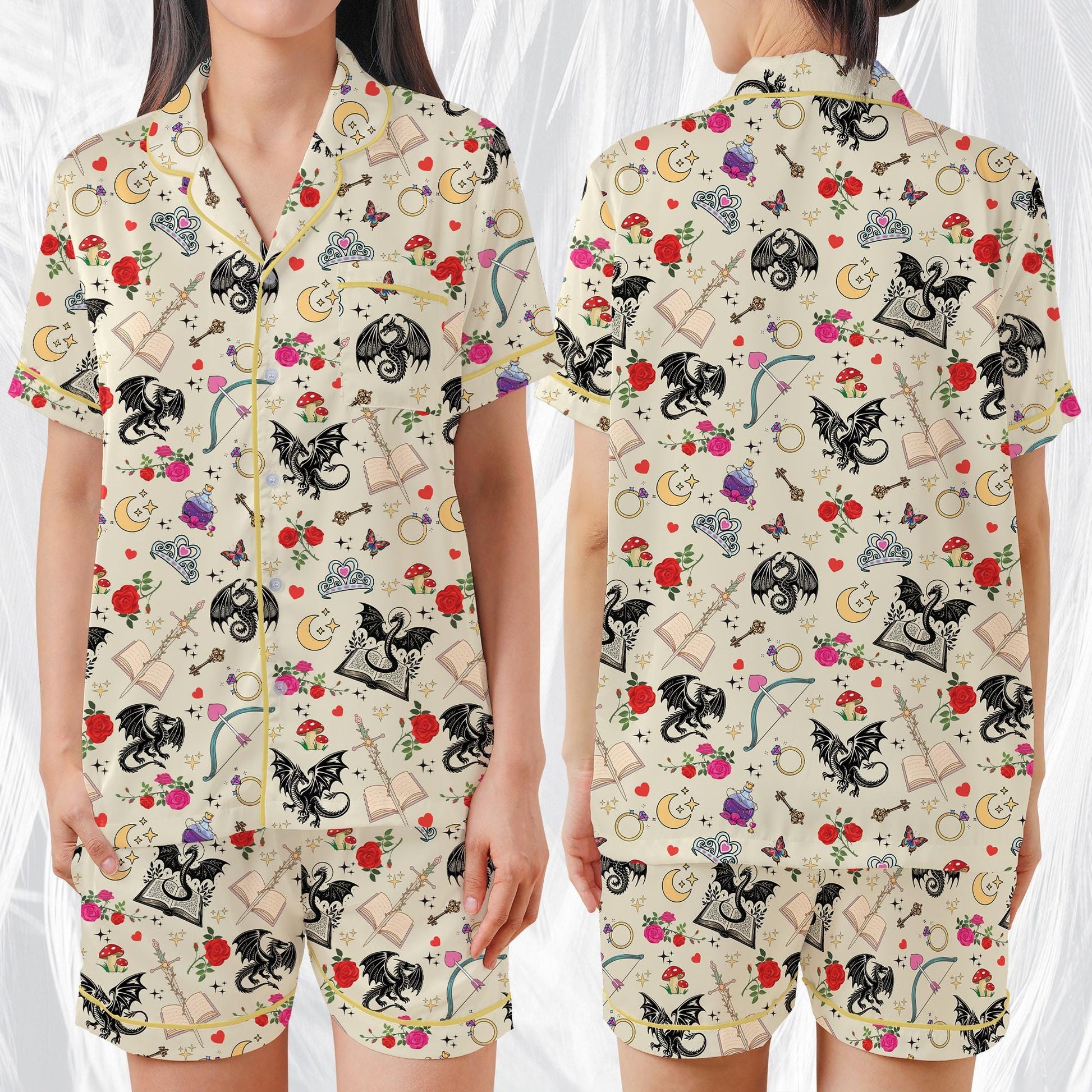 Romantasy Dragon Pajamas Set, Cute Bookish Sleepwear, Retro Fantasy Reader Home Wear Pajama Set, Girl Enemies To Lovers Reading Gift