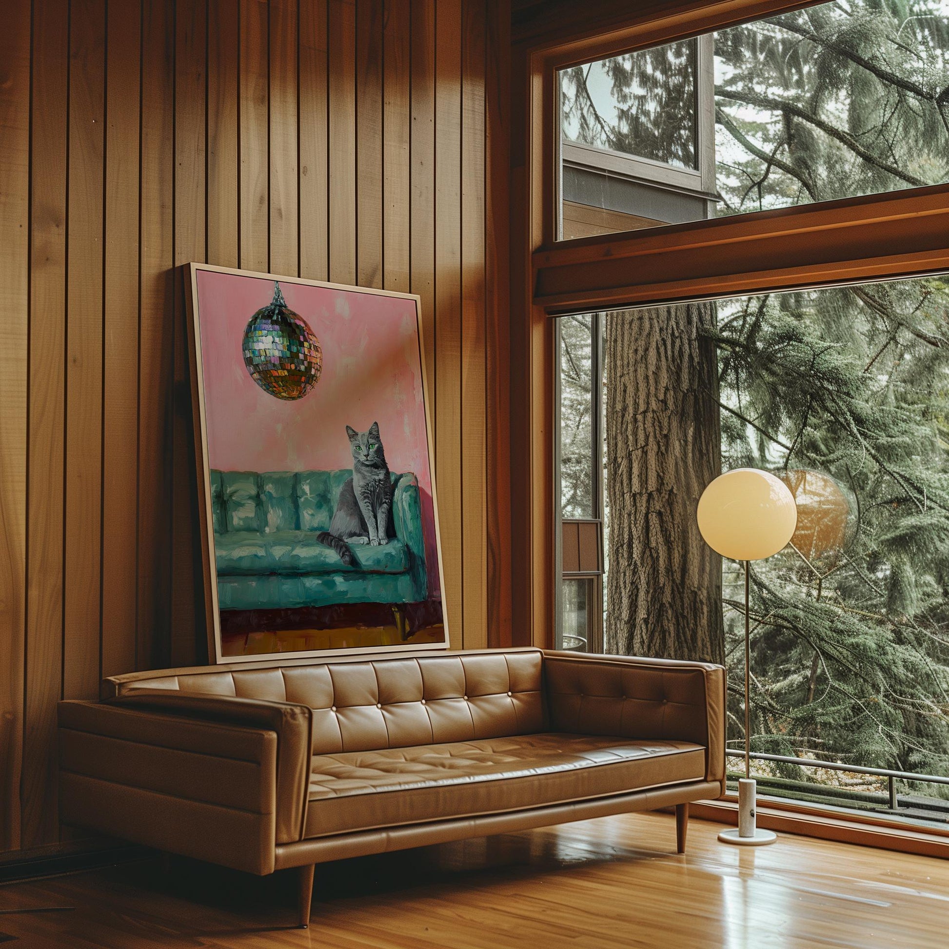 Russian Blue Cat with Disco Ball Fine Art Print | Cute Quirky Whimsical | Disco Ball Cat | Bar Cart Decor | Trendy Home Wall Art Gift