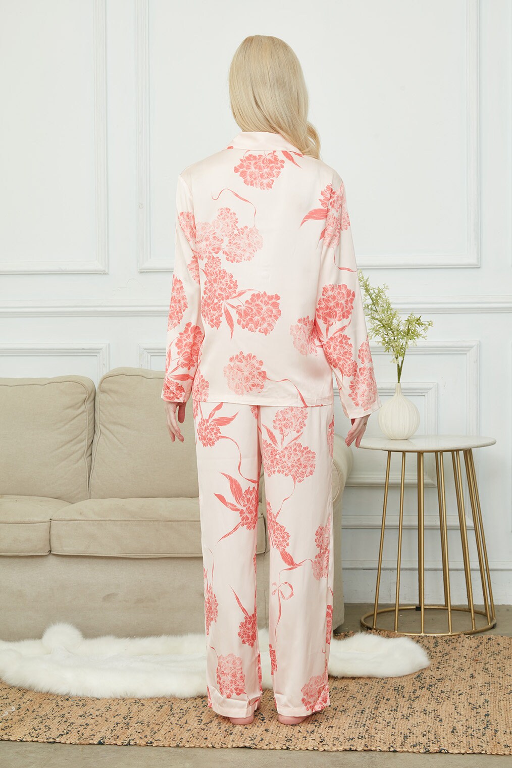Satin Laurustinus Print Long Pyjama Set, Bride And Bridesmaids Pajama,Gift For Her, Personalized Gift For Bridesmaids?2 Colors Available