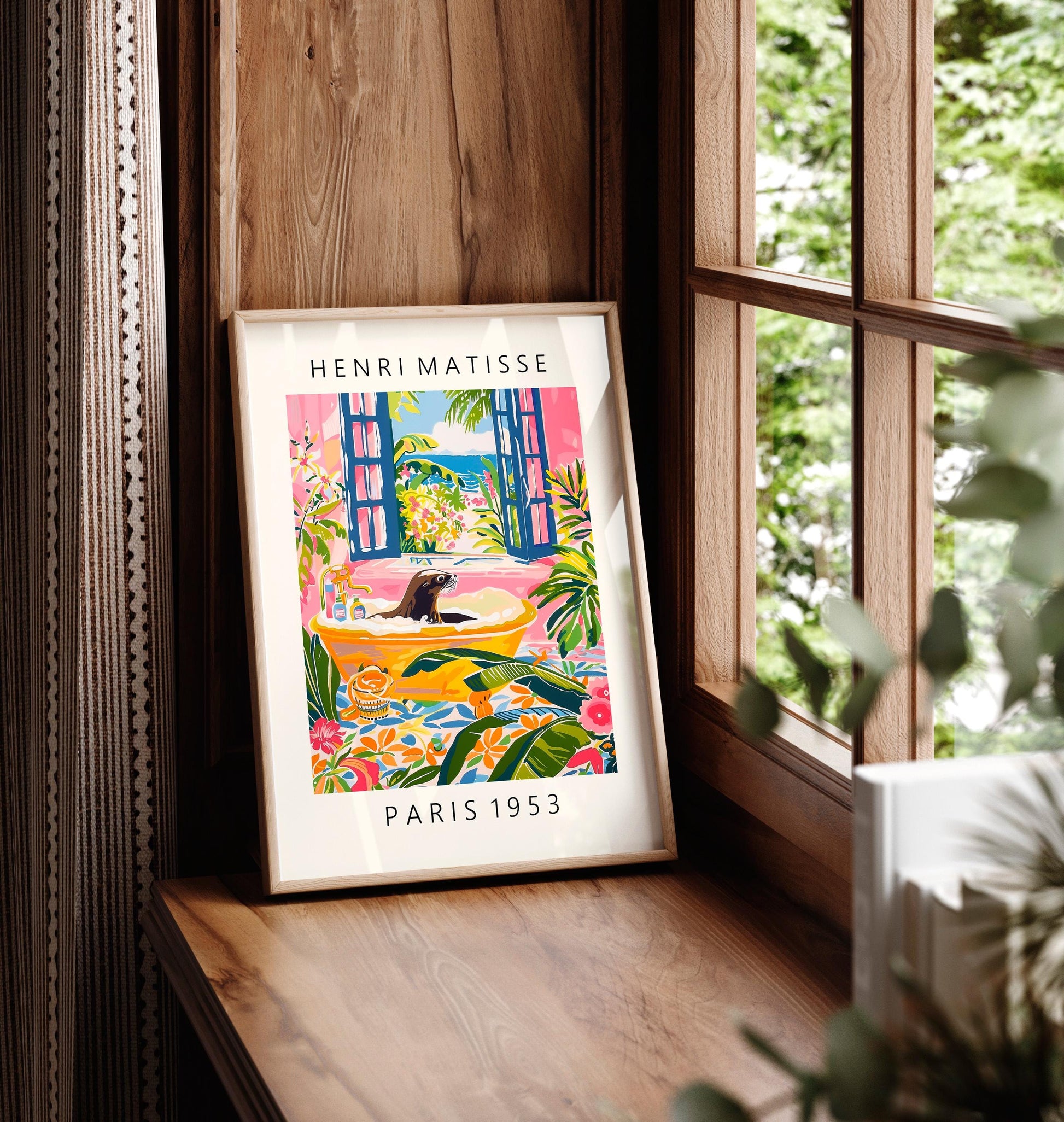 Sea lion in bathtub funny poster, Matisse art, Pink tropical decor, Bathroom wall art, Beach house print
