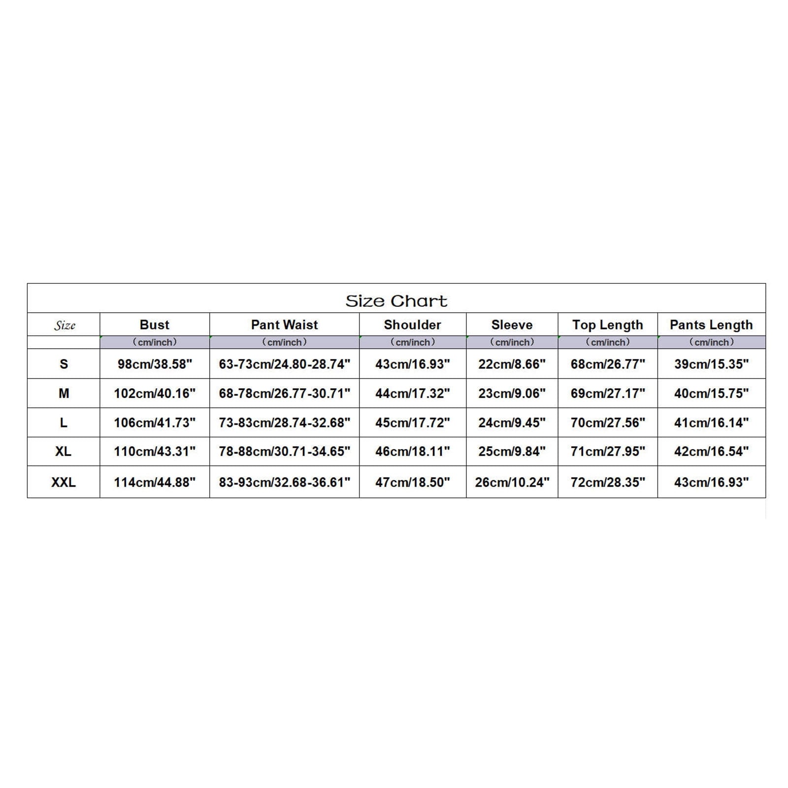 | 1/2 Chest (in/cm) | Length (in/cm) | Sleeve (in/cm) | Waist (in/cm) | Length (in/cm) | Inseam (in/cm) | |