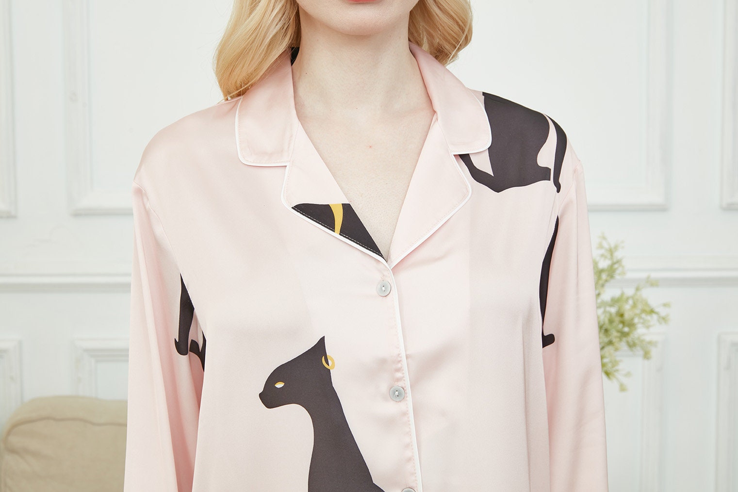 Silky Long Pyjama Set, Bride And Bridesmaids Pajama, Pajama Set For Women , Black Sphinx Print, Gift For Cat persons,Could Be Wear Outside