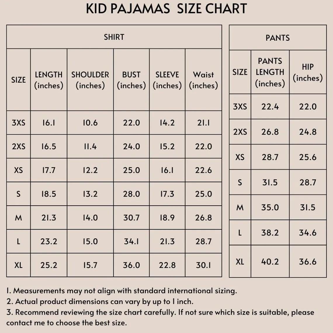 📌 Measurements are garment measurements. For a relaxed fit, compare with a similar PJ your child already wears.