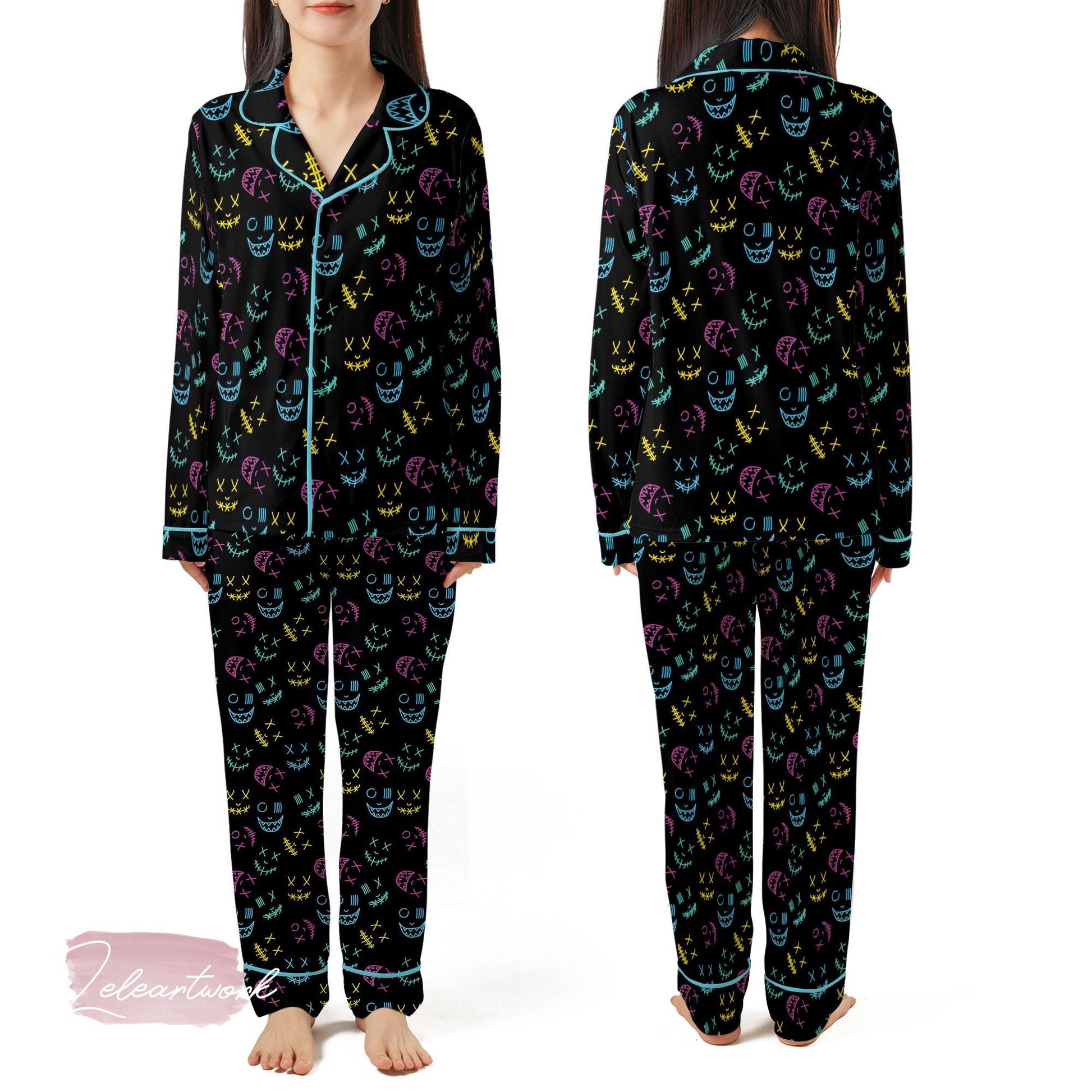 Smile Gravity Set – Neon Skull Face Pajama Shorts | Glow-in-the-Dark Graffiti Sleepwear | Funky Halloween Lounge Gift