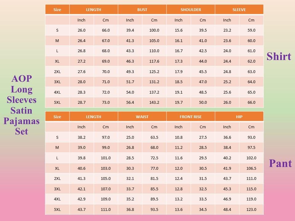| 1/2 Chest (in/cm) | Length (in/cm) | Sleeve (in/cm) | Waist (in/cm) | Length (in/cm) | Inseam (in/cm) | |