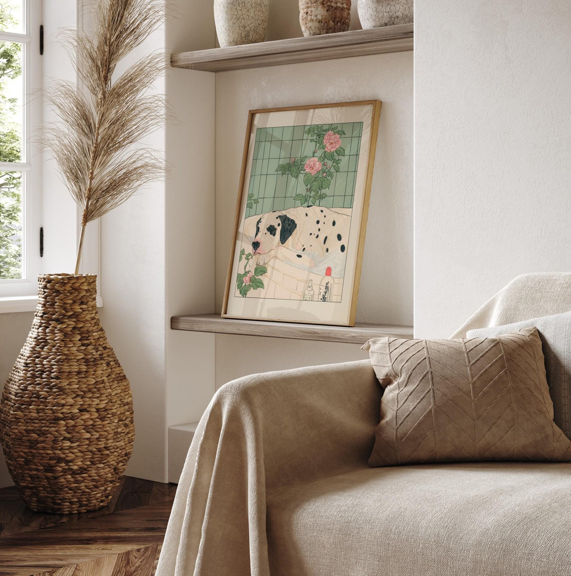 Spotty Great Dane taking a bath, Funny Japanese bathroom wall print, Dog lover gift, Japandi ukiyo-e aesthetic poster, Minimalist decor