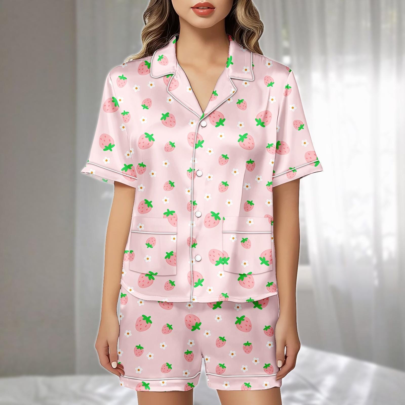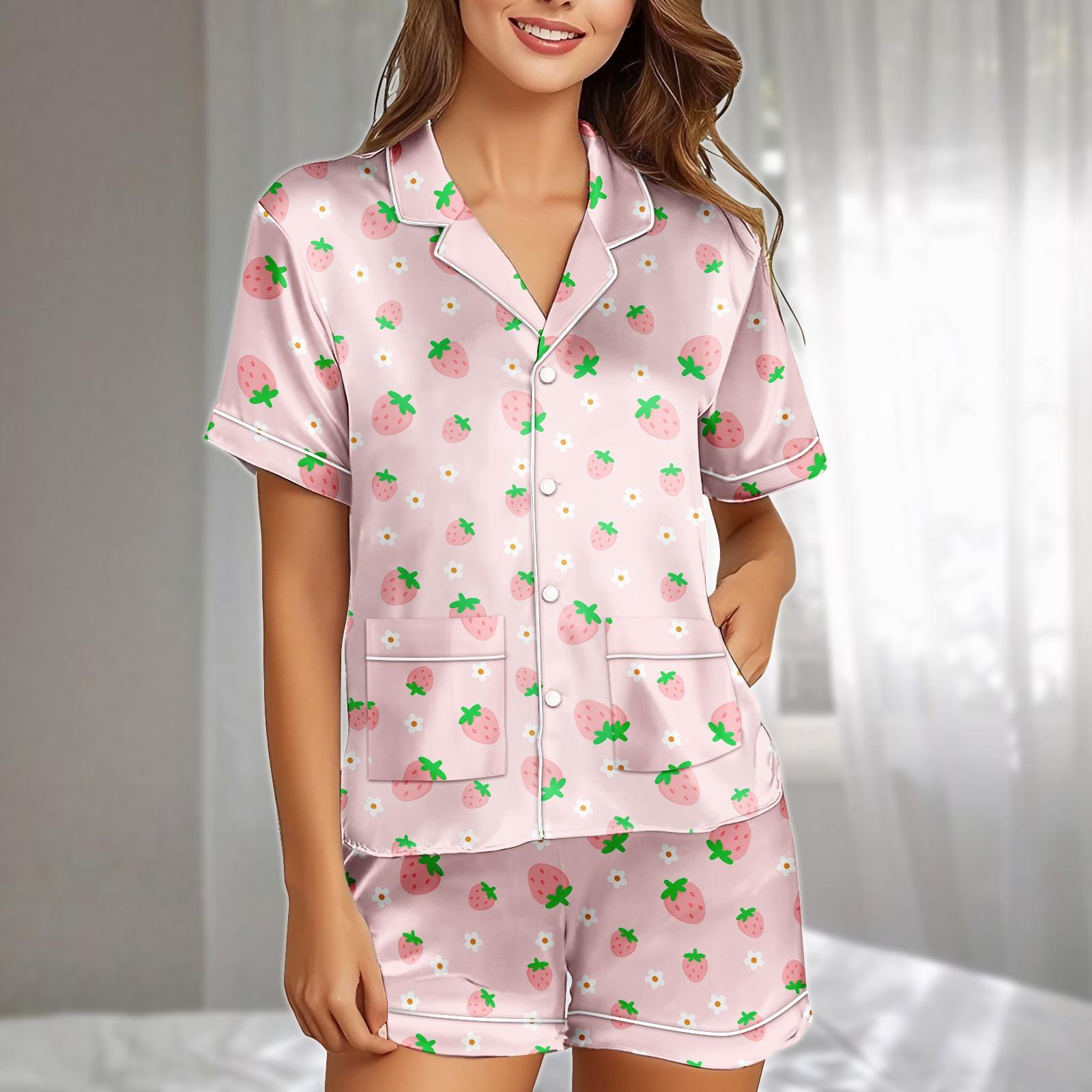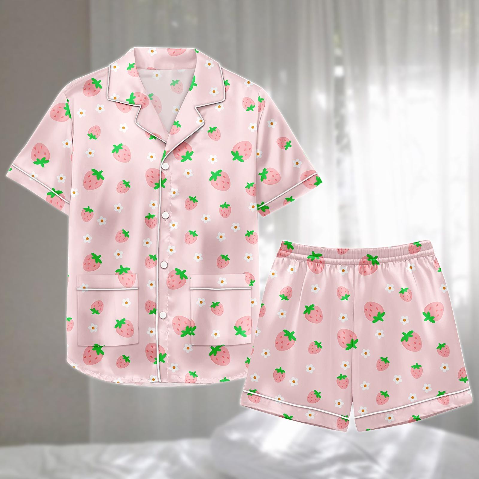 Strawberry Satin Pajamas Short Set, Pink Fruit And Flower Print Womens Pj Set, Cute Sleepwear For Summer Nights, Gift For Her