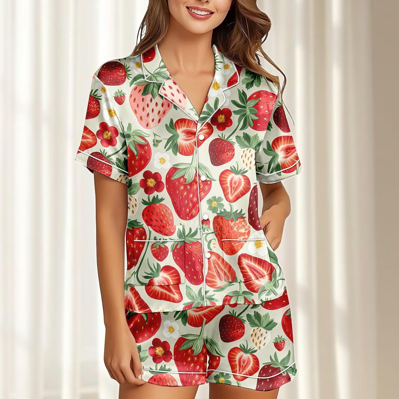 Strawberry Satin Pajamas Short Set, Red Fruit Summer Sleepwear, Red Berry Pjs, Short Sleeve Loungewear, Matching Pajamas, Gift For Her