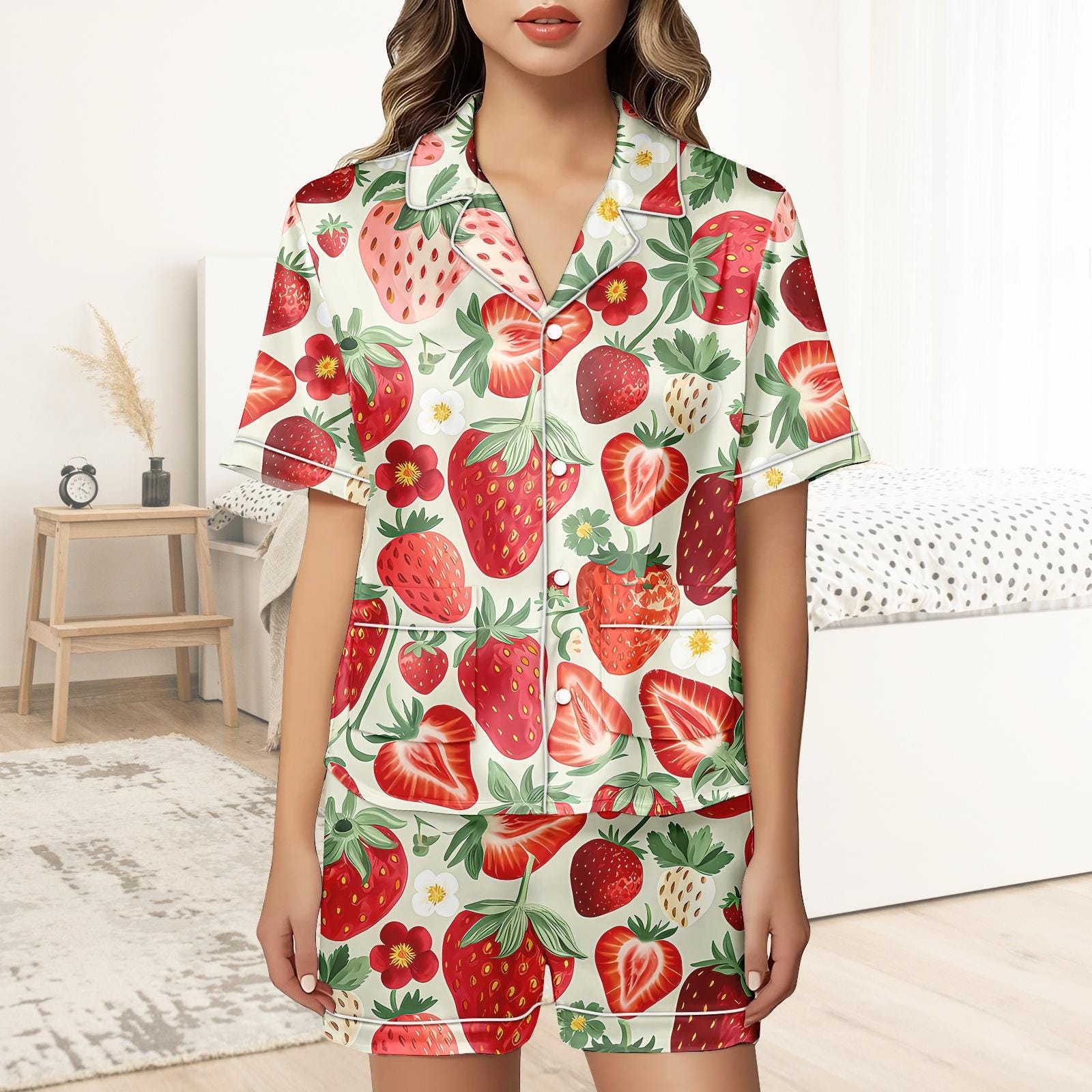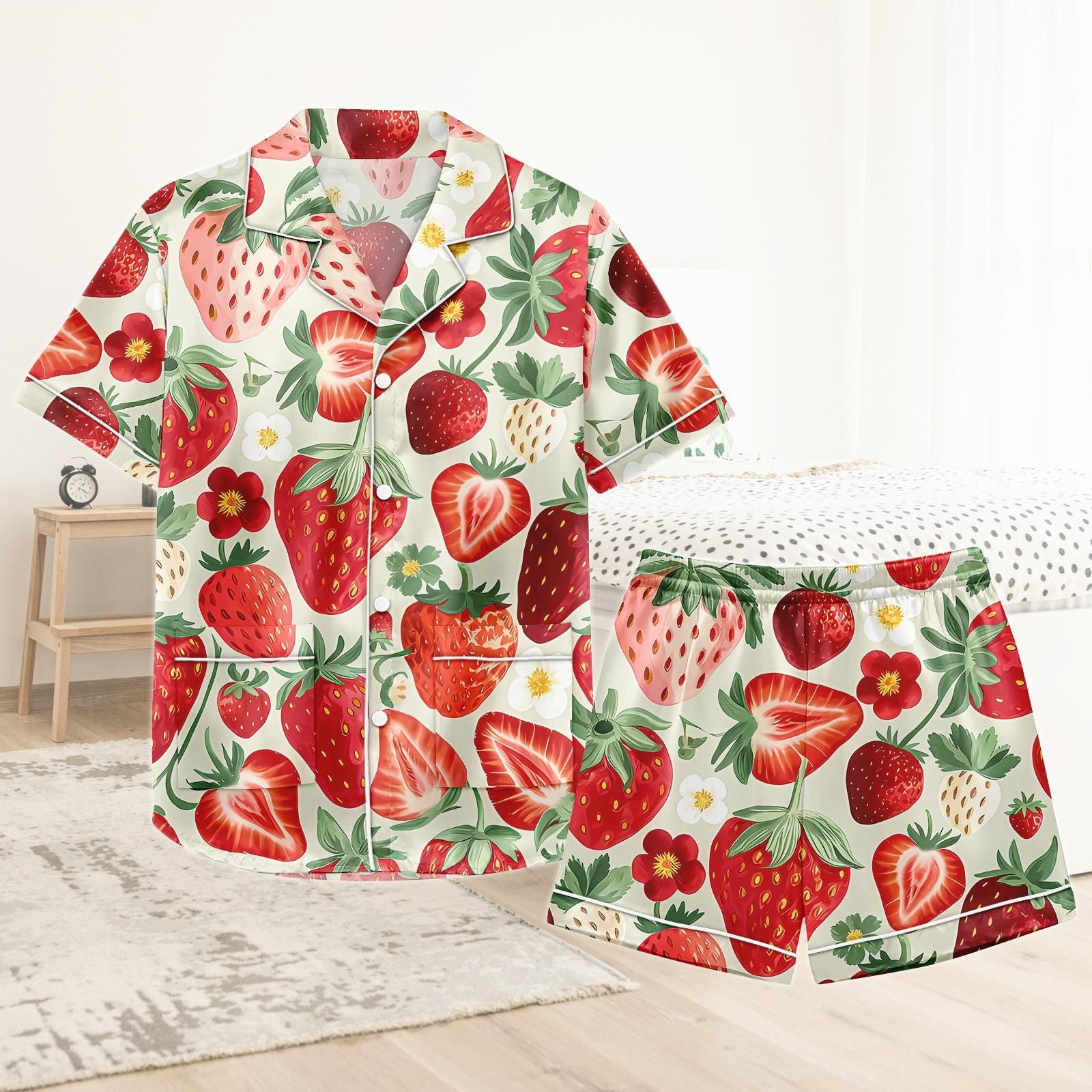 Strawberry Short Satin Pajamas, Fruity Strawberry Pajamas Set Women, Pastel Silk Pajamas For Women, Kawaii Matching Pajamas Women
