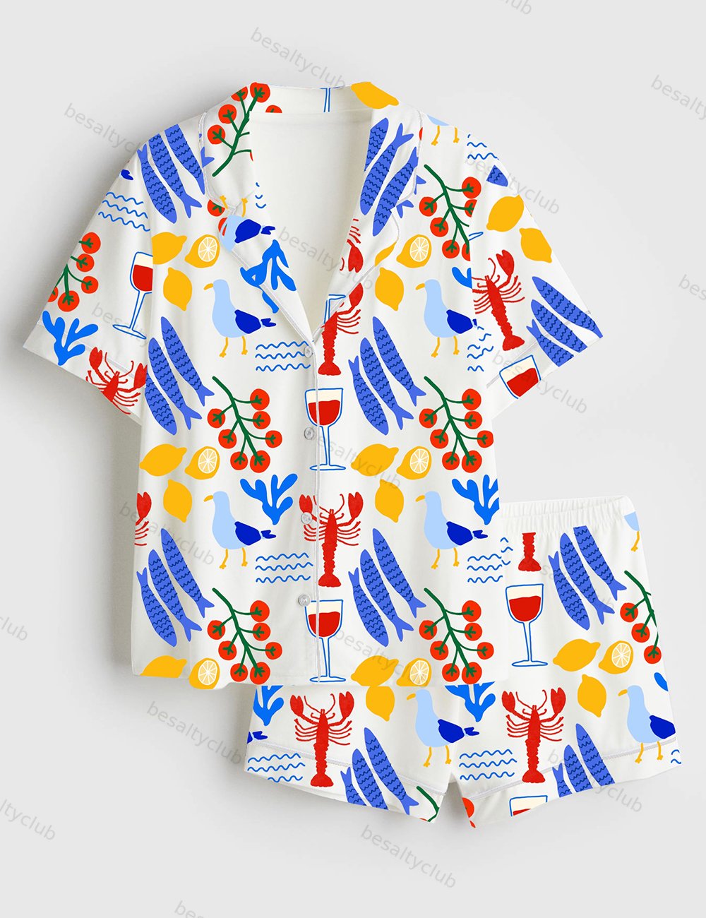 Summer Coastal Pattern Short Sleeve Satin Pajama Set