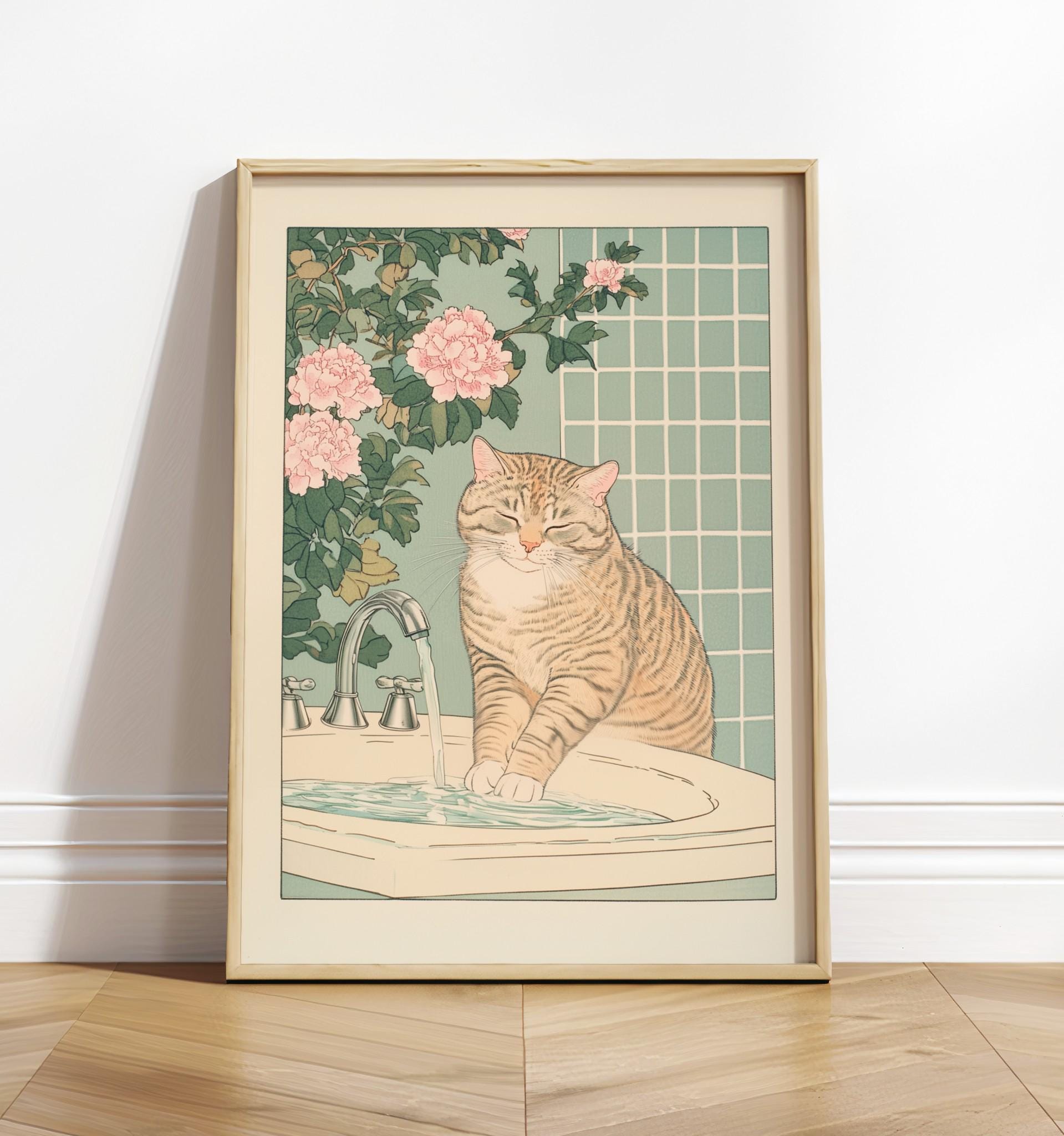 Tabby Cat Bathroom Print: Ukiyo-e Japanese Wall Art