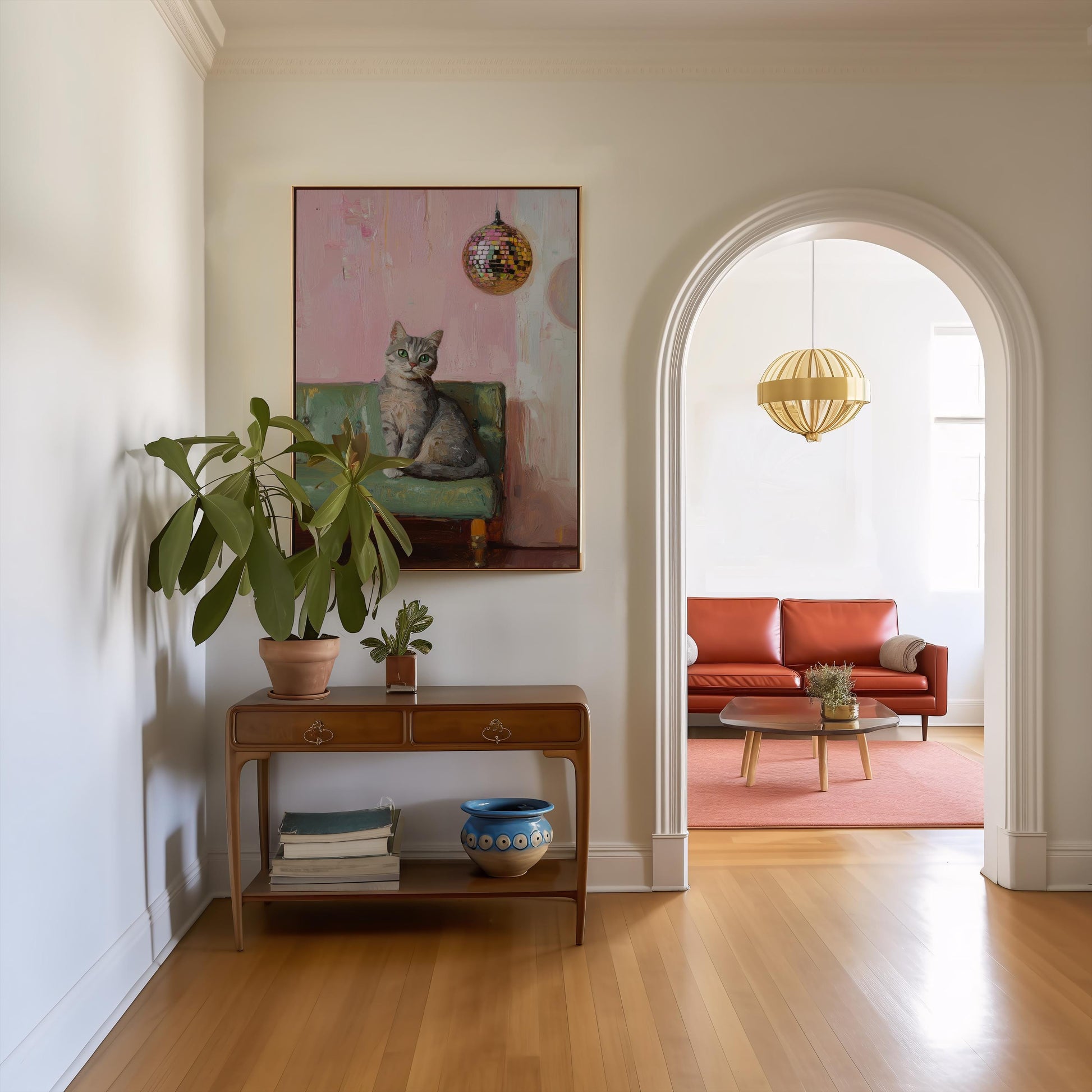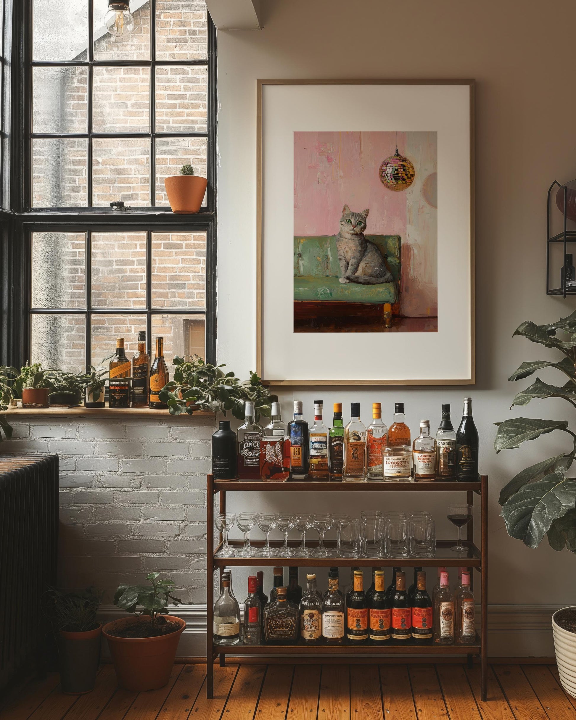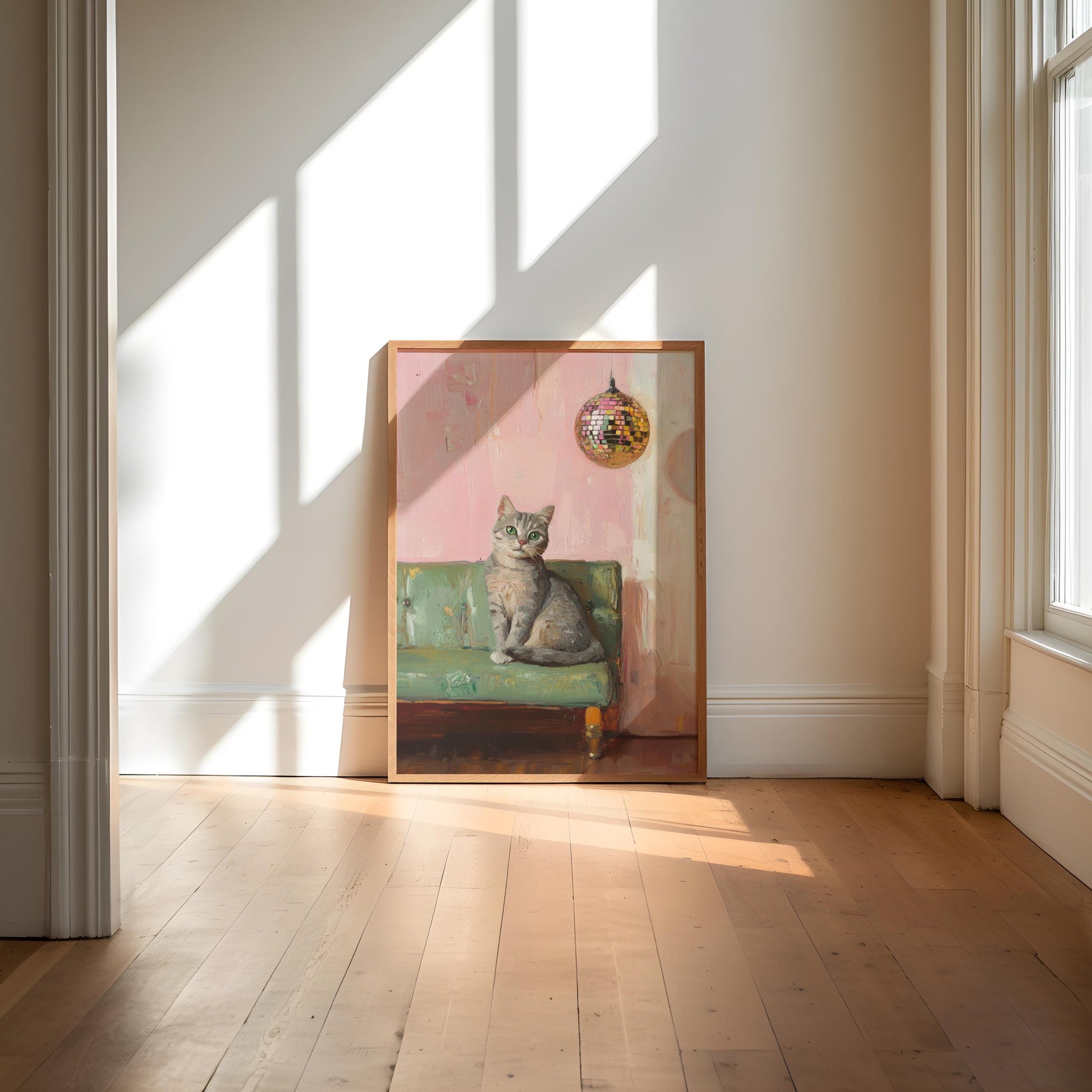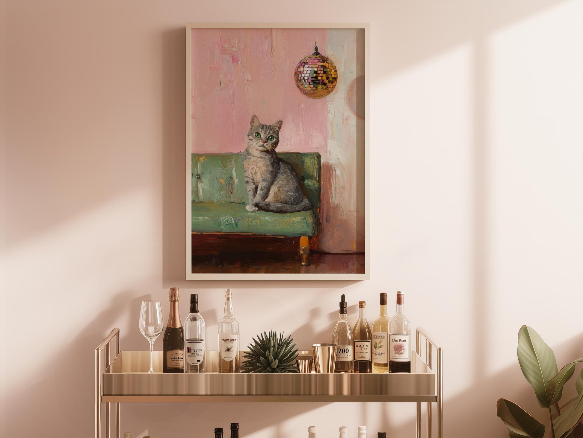 Tabby Cat with Disco Ball Art Print | Cute Quirky Whimsical | Cocktail Art Bar Cart Decor | Fine Art Print Gift | Trendy Home Wall Art Print
