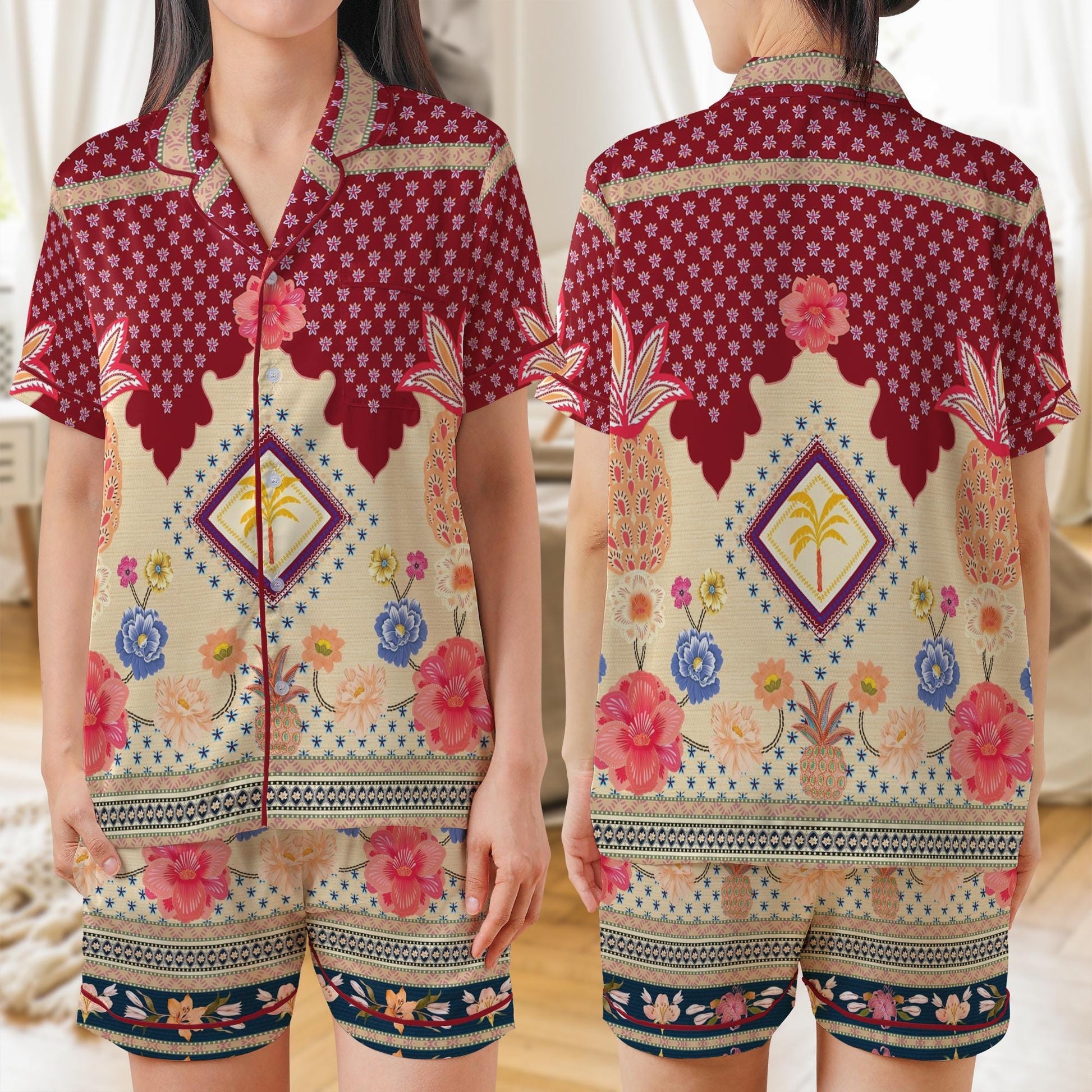 Tropical Flower Satin Pajamas Set, AOP Short Sleeve Women’s Summer Sleepwear, Lightweight Floral Loungewear, Cute Gift for Her