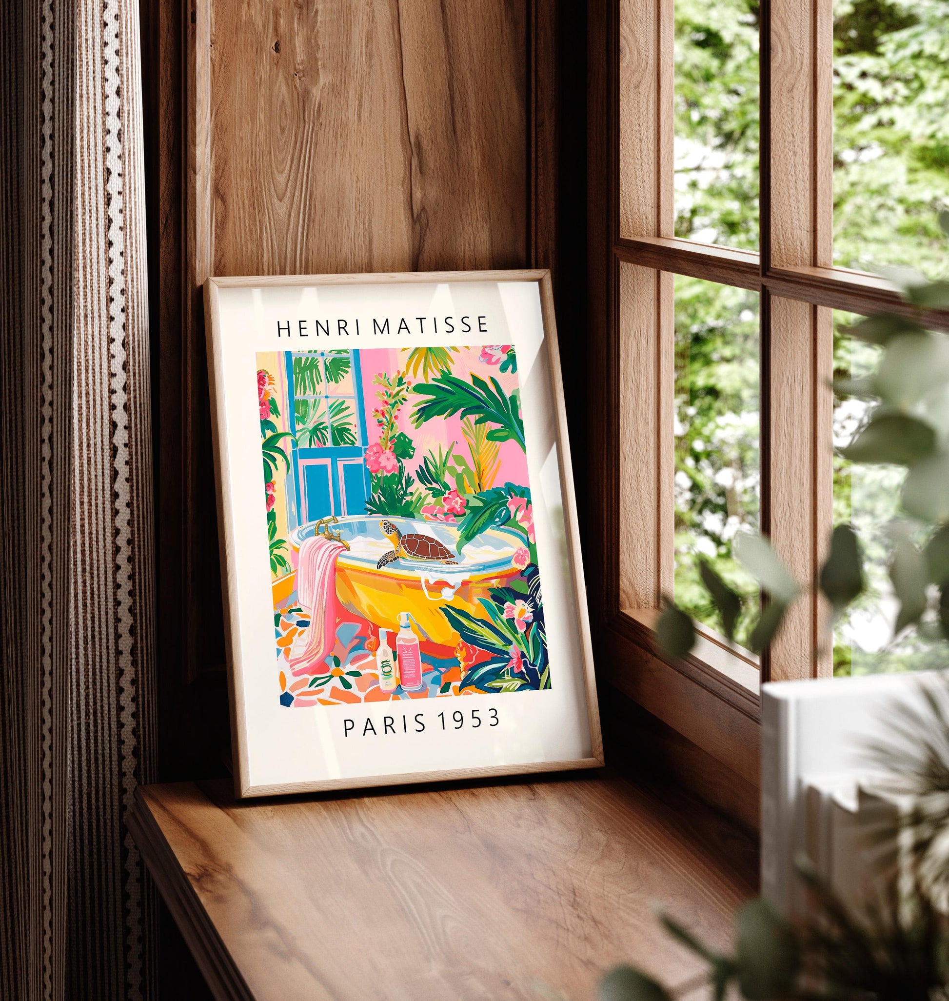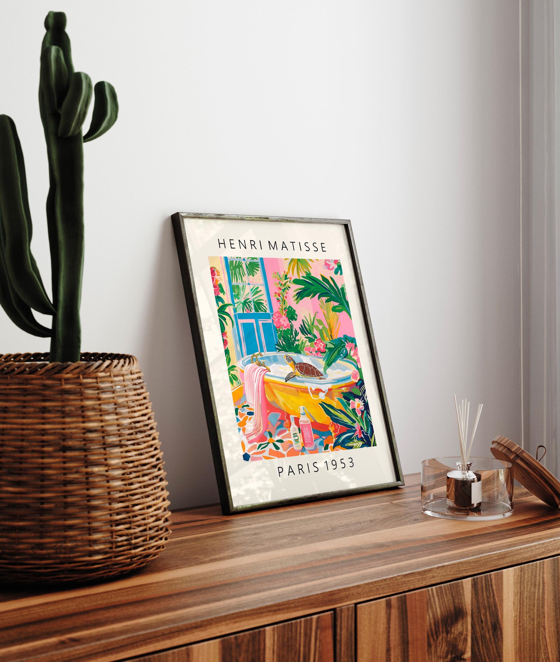 Turtle in Bathtub Art Print: Matisse Style Bathroom Dopamine Decor
