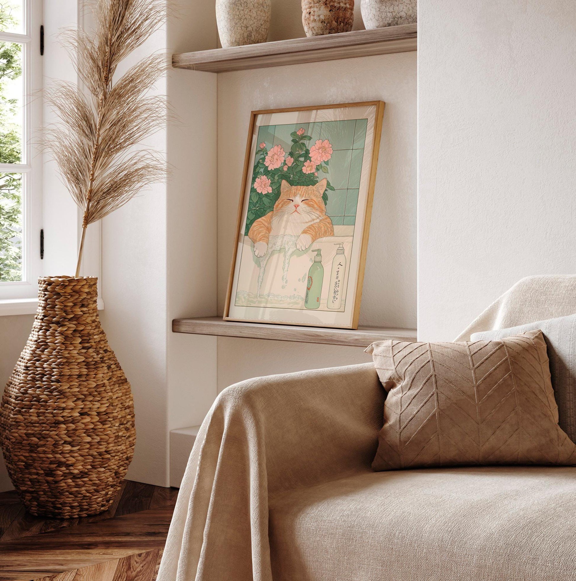 Ukiyo-e Cat Print: Funny Ginger Cat in Bathtub, Japanese Art