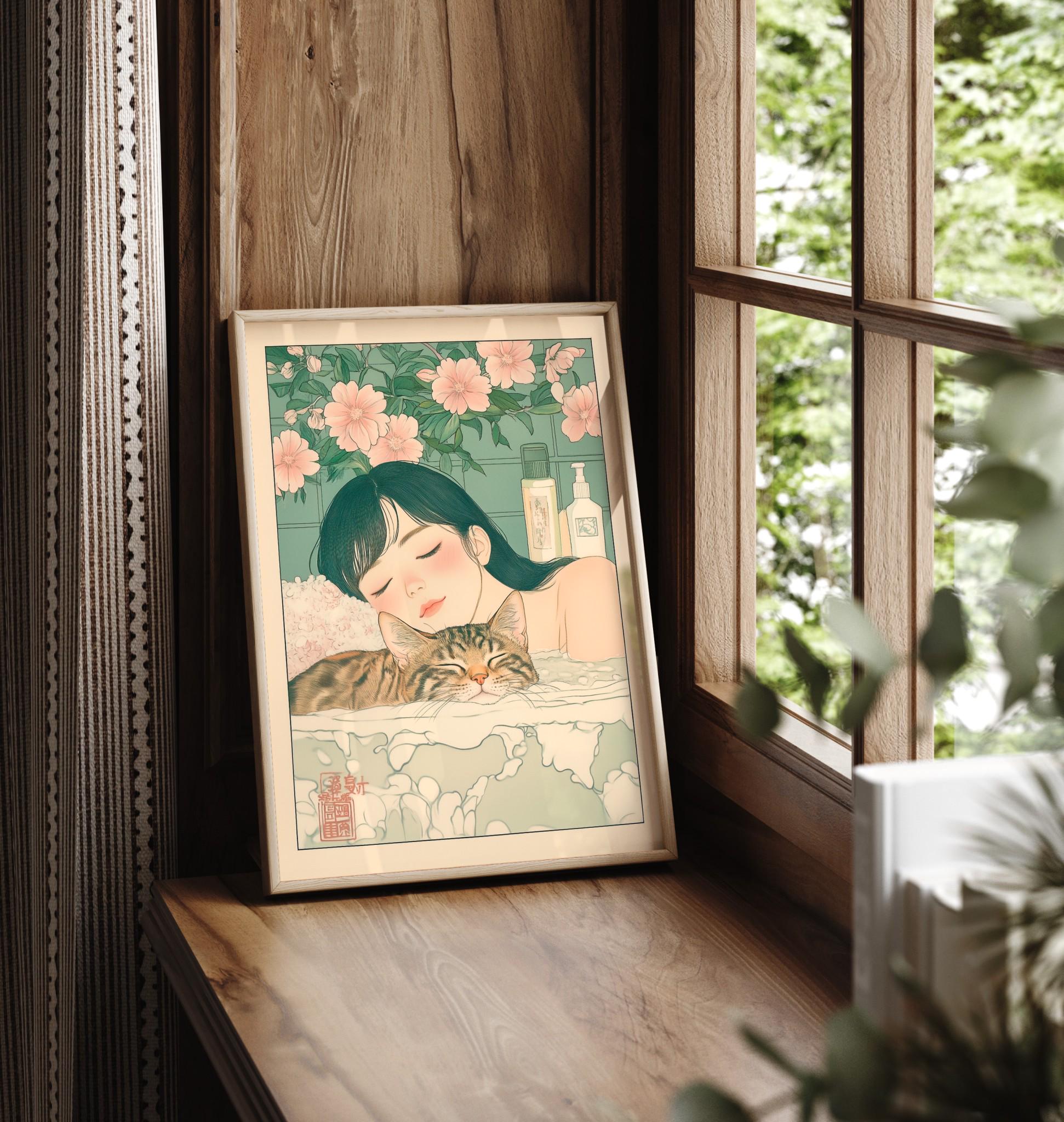 Ukiyo-e Woman and Tabby Cat Art: Japanese Bathroom Print