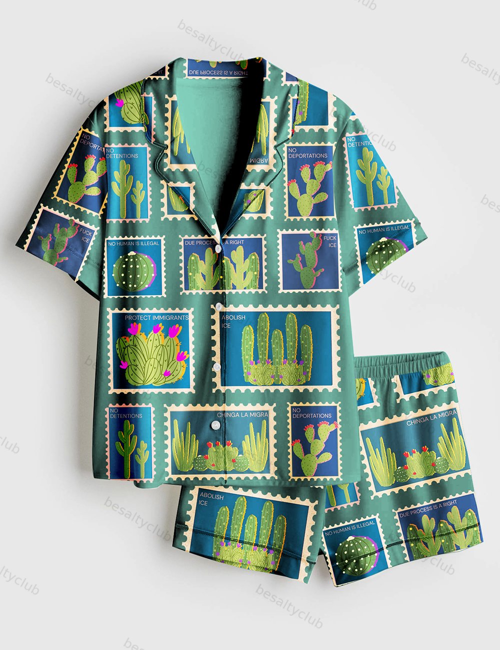 Vintage Chinga La MigraSecret Message Postage Stamps Anti ICE Tee Abolish Ice Print Short Sleeve Satin Pajama Set