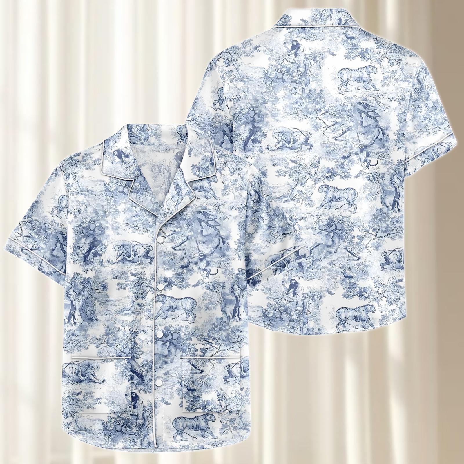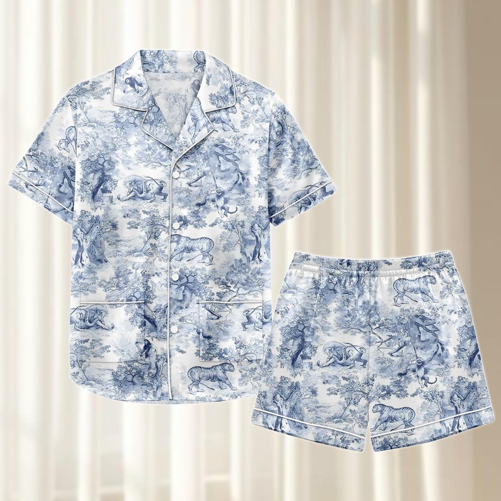 Wild Animal Satin Pajamas Short Set, Safari Matching Pjs, Tiger Elephant Lion Sleepwear, Vintage Jungle Loungewear, Gift For Her