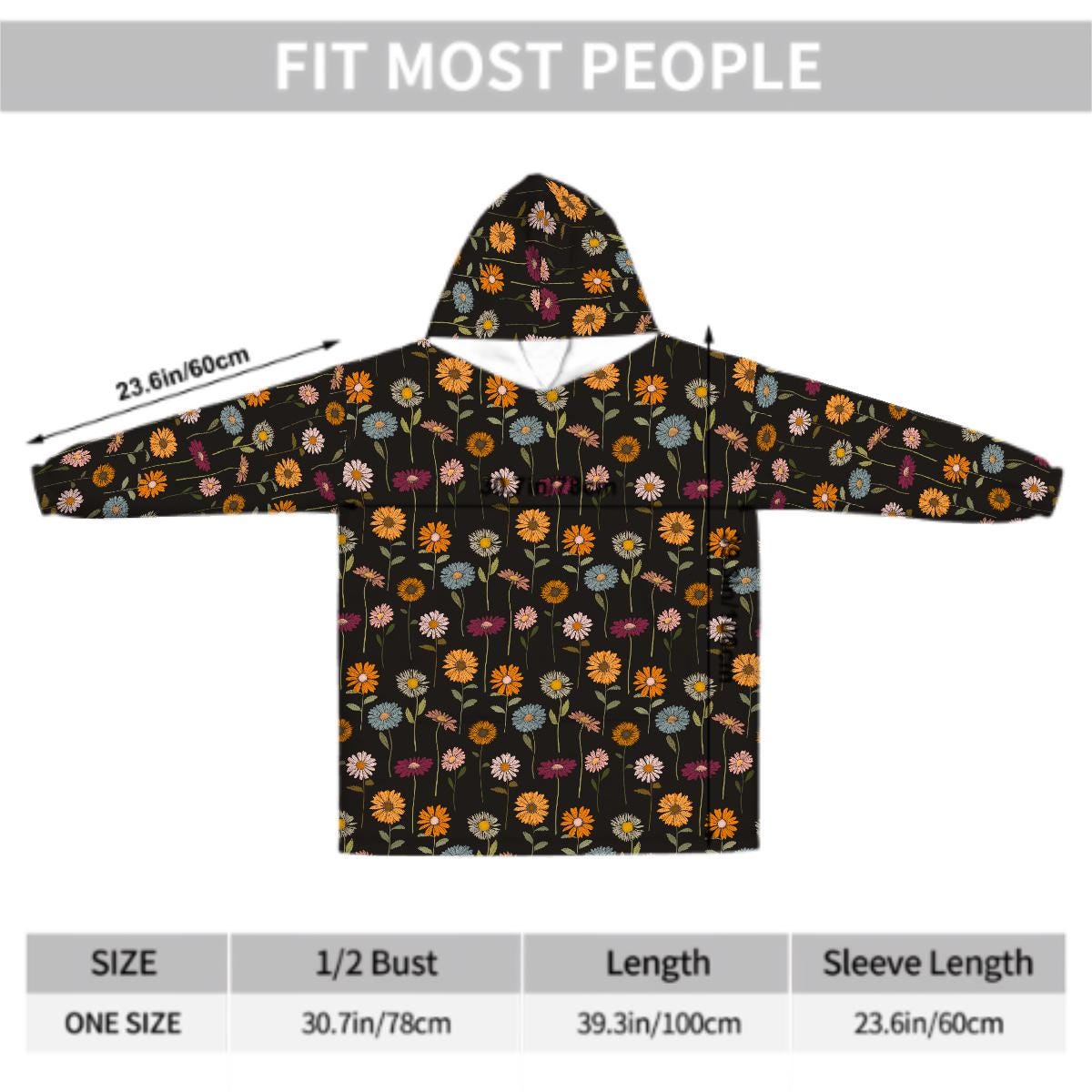 Wildflower Blanket Hoodie, Boho Witchy Black Hooded Jumper, Winter Fall Accessory