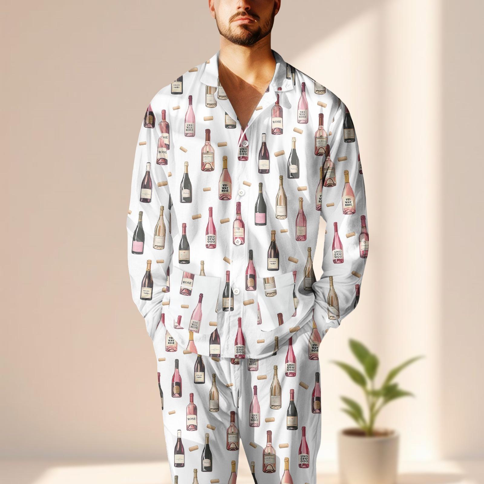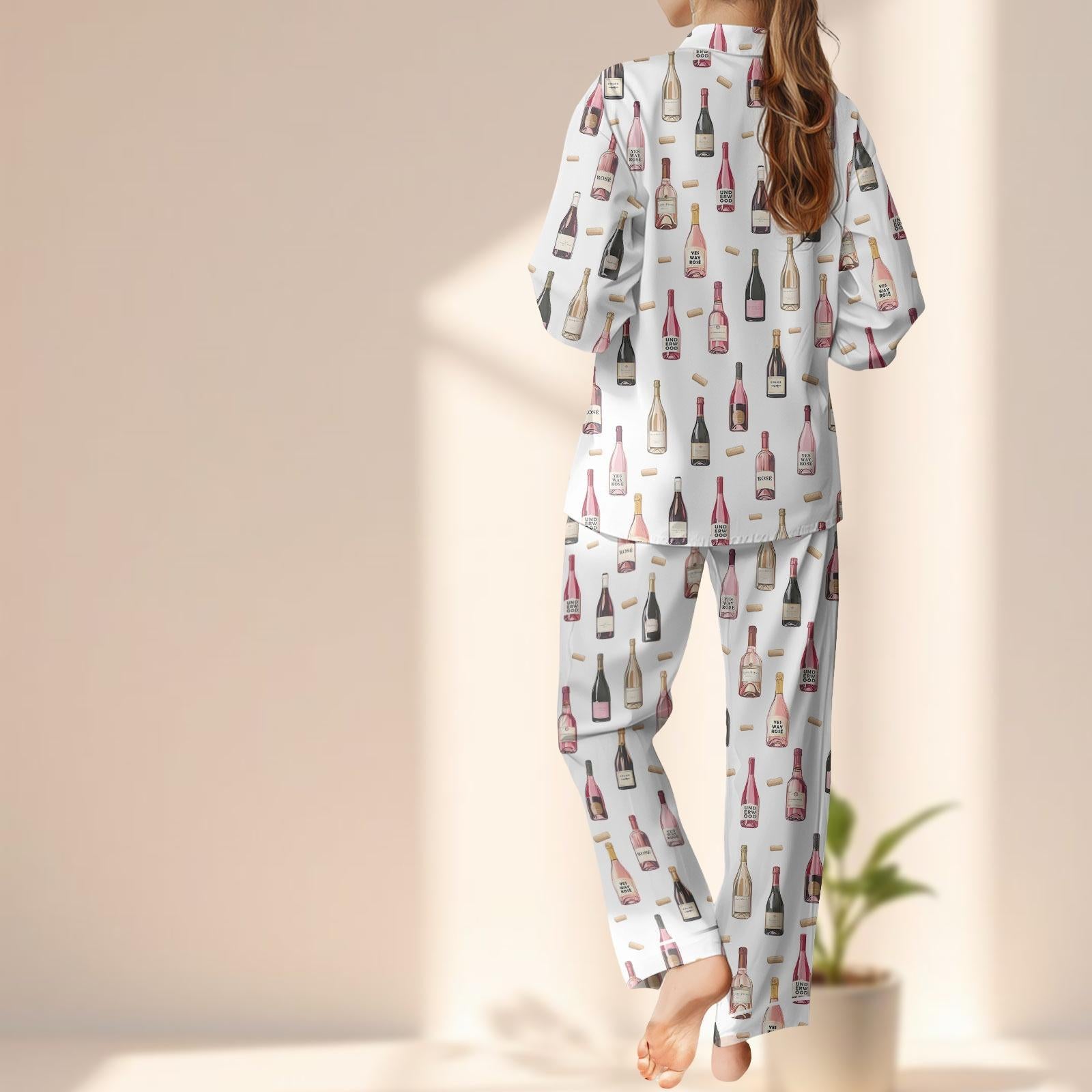 Wine Bottle Satin Pajama Set, Funny Champagne Women Pajamas, Long Sleeve Loungewear, Wine Lover Sleepwear, Birthday Gift For Her