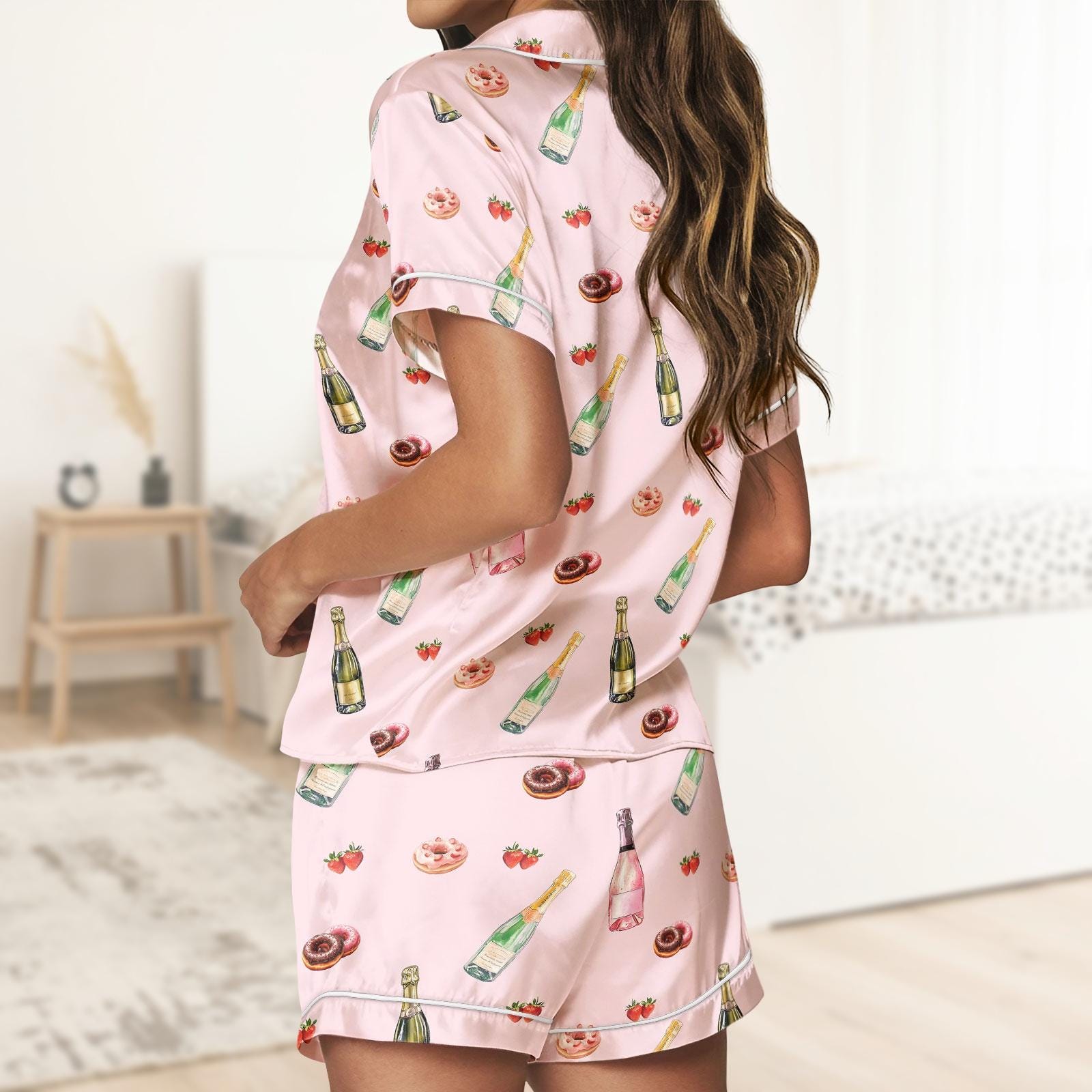 Wine Strawberry Short Satin Pajamas, Wine Lover Bridal Party Pajamas, Soft Summer Short Sleeve Pajamas, Drink Beer Matching Pajamas