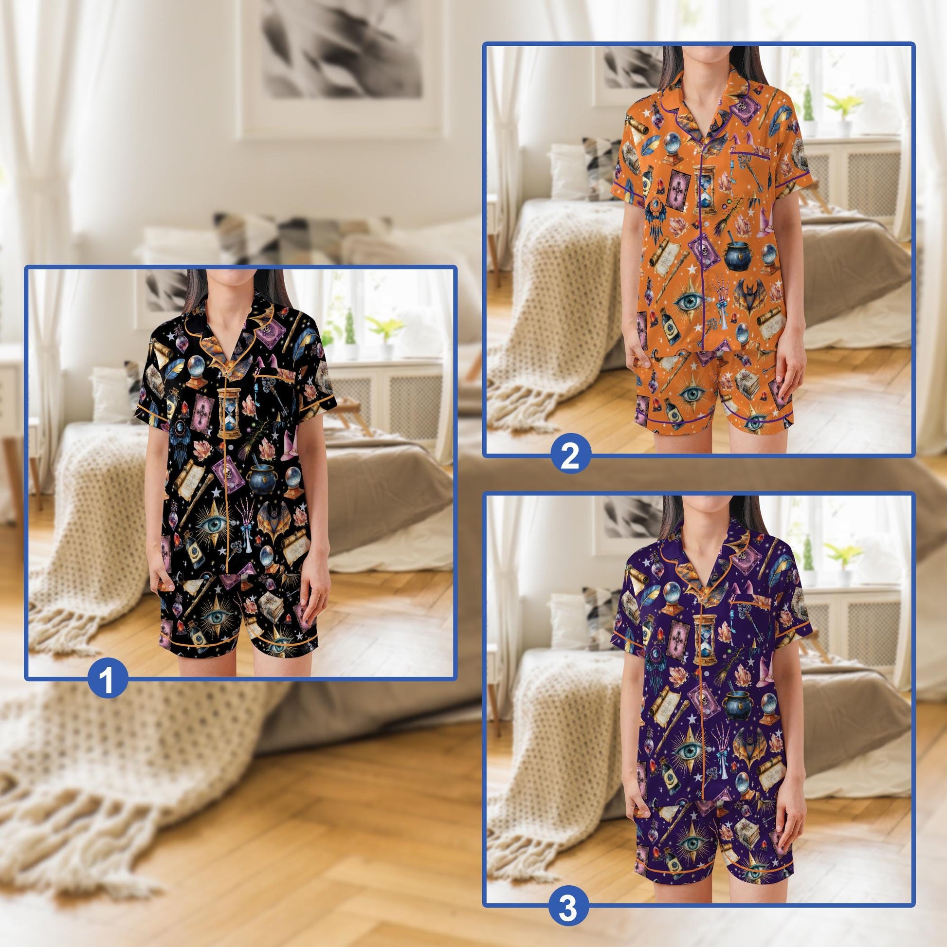Witchy Magic Satin Pajama Set, Mystical Celestial Pajama Set, Gothic Halloween Sleepwear, Spooky Season Pajamas, Trick Or Treat Nightwear