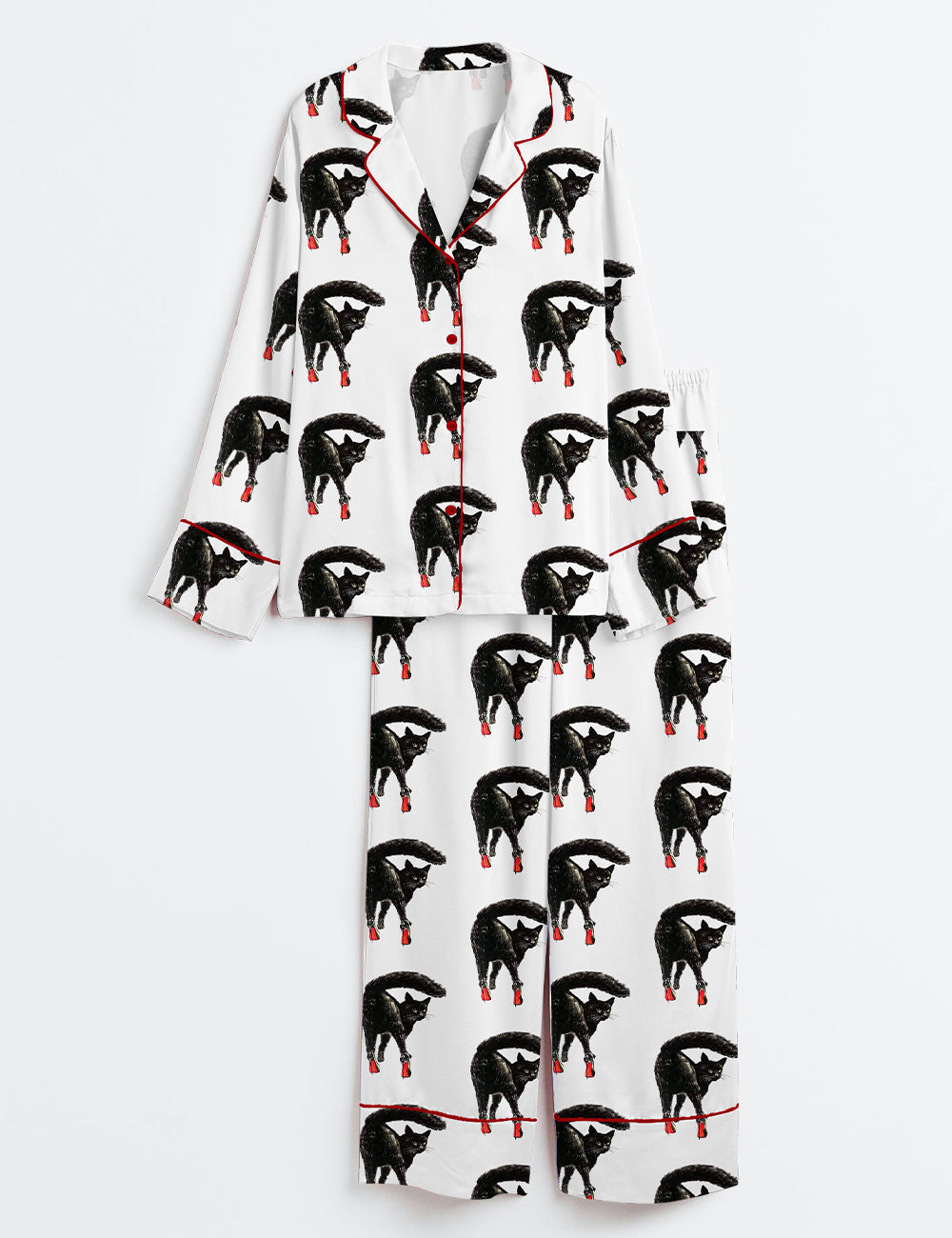 Women’s Black Cat Wearing High Heels Long Sleeve Satin Pajama Set