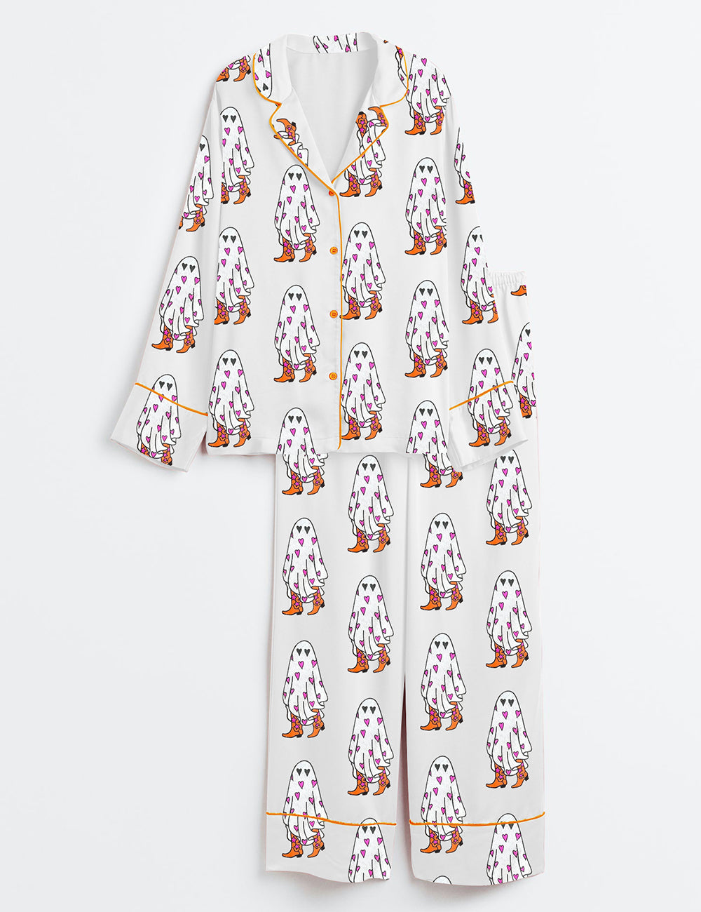 Women’s Boo In Boots Western Cowgirl Halloween Spooky Ghost Long Sleeve Satin Pajama Set
