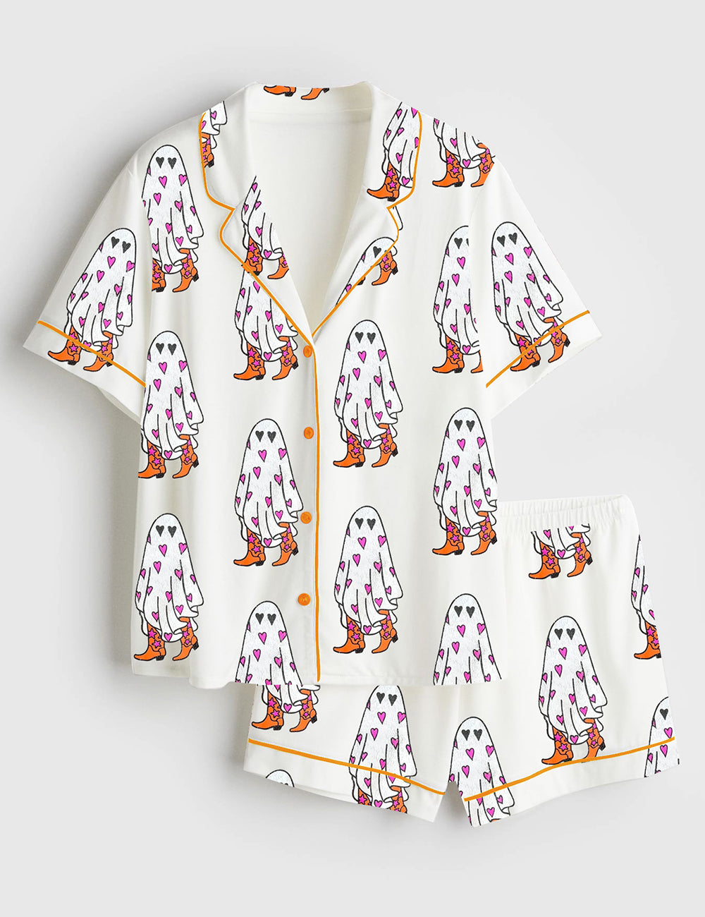 Women’s Boo In Boots Western Cowgirl Halloween Spooky Ghost Short Sleeve Satin Pajama Set