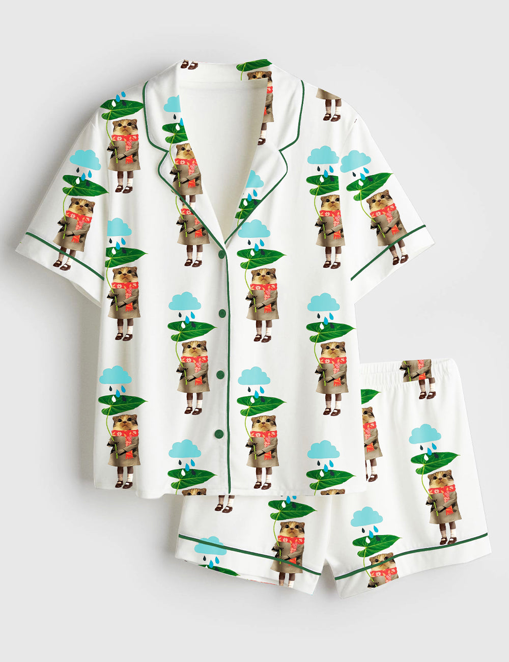 Women’s Cat In The Rain Short Sleeve Satin Pajama Set