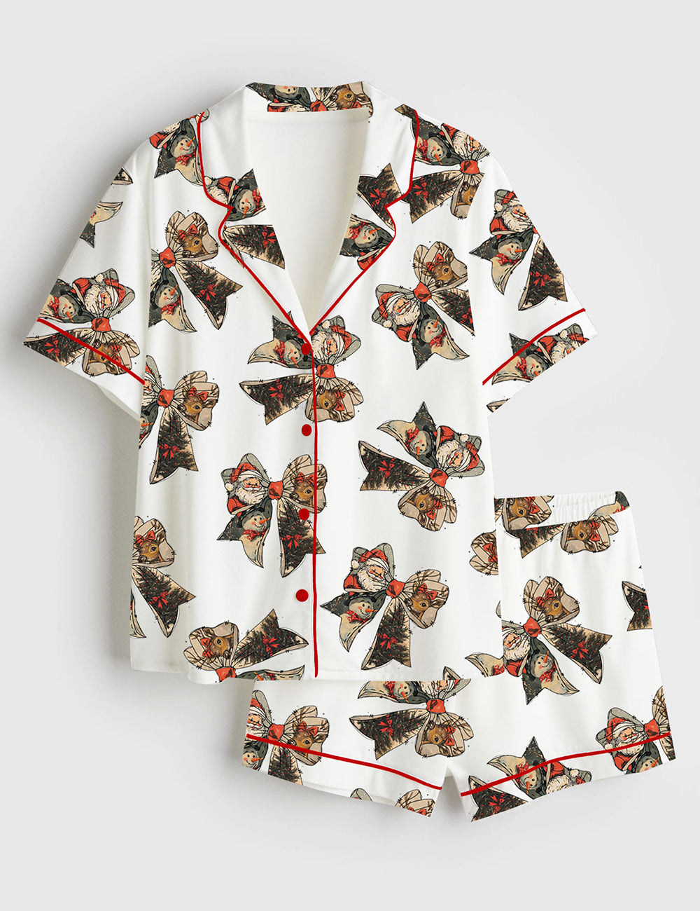 Women’s Christmas Coquette Bow Santa Claus Reindeer Snowman Short Sleeve Satin Pajama Set