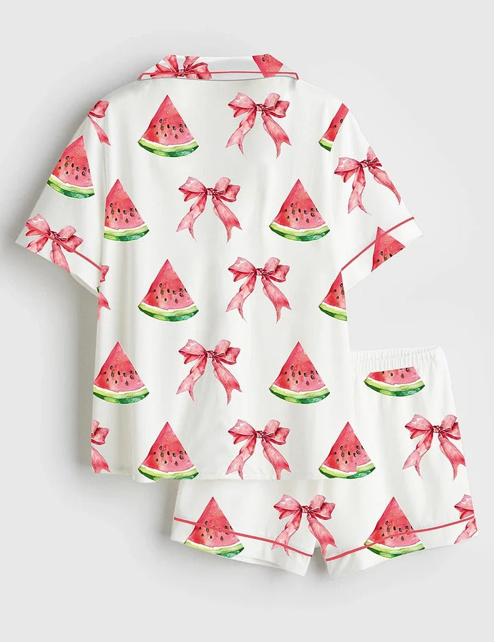 Women’s Coquette Watermelon Trendy Summer Beach Babe Short Sleeve Satin Pajama Set