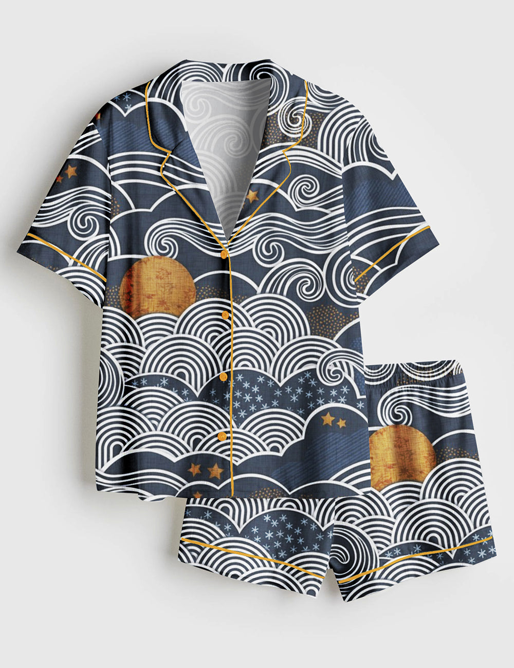 Women’s Cozy Night Sky Navy Blue Full Moon and Stars Over the Clouds Moody Sky Short Sleeve Satin Pajama Set