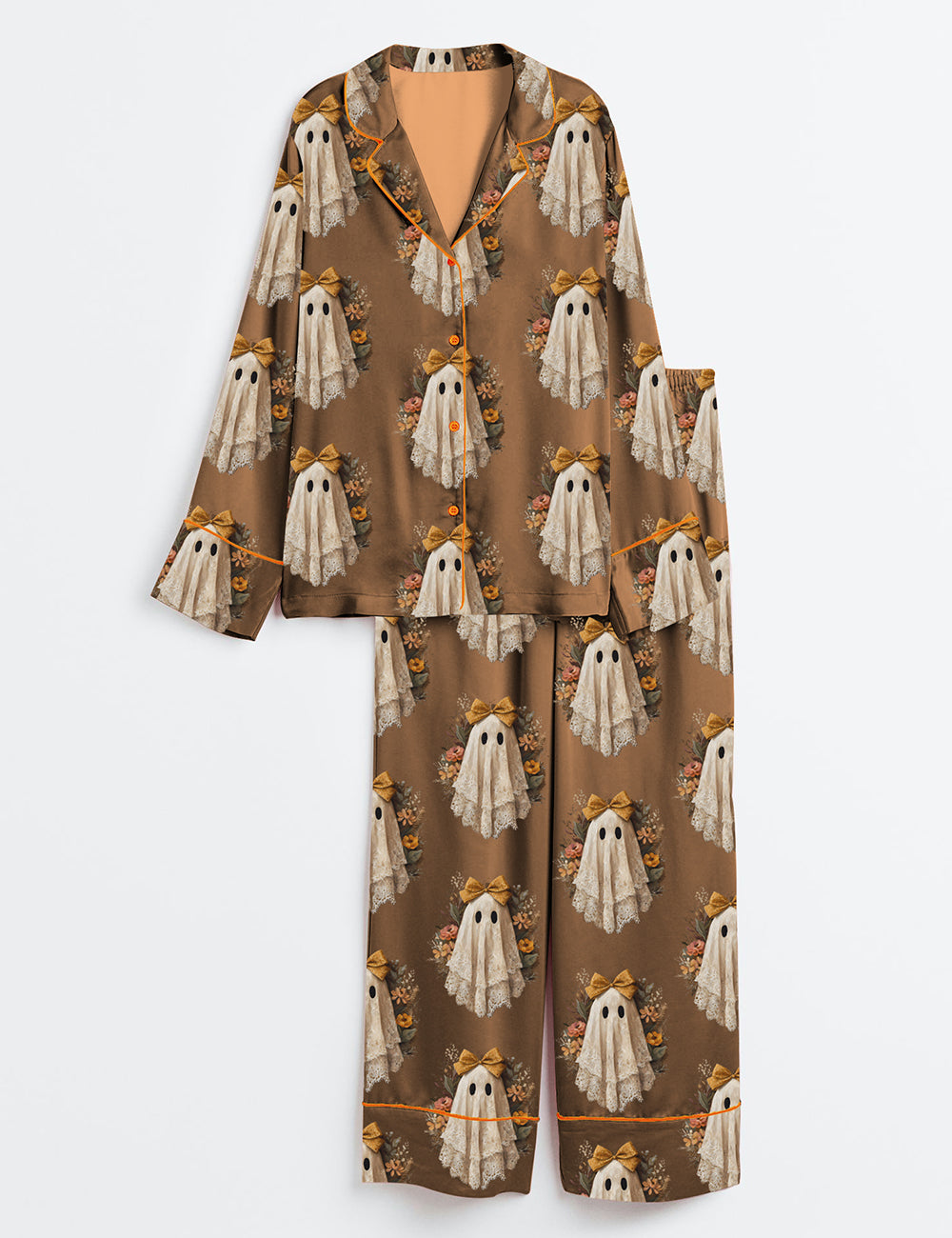 Women’s Cute Halloween Ghost With Lace Dress Fall Floral Bouquet Long Sleeve Satin Pajama Set