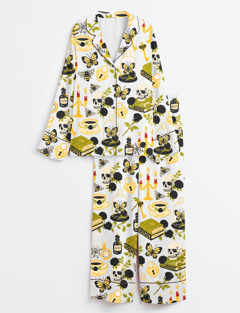 Women’s Dark Academia Halloween Skull Red Rose Gothic Witchy Spooky Cozy Aesthetic Print Long Sleeve Satin Pajama Set
