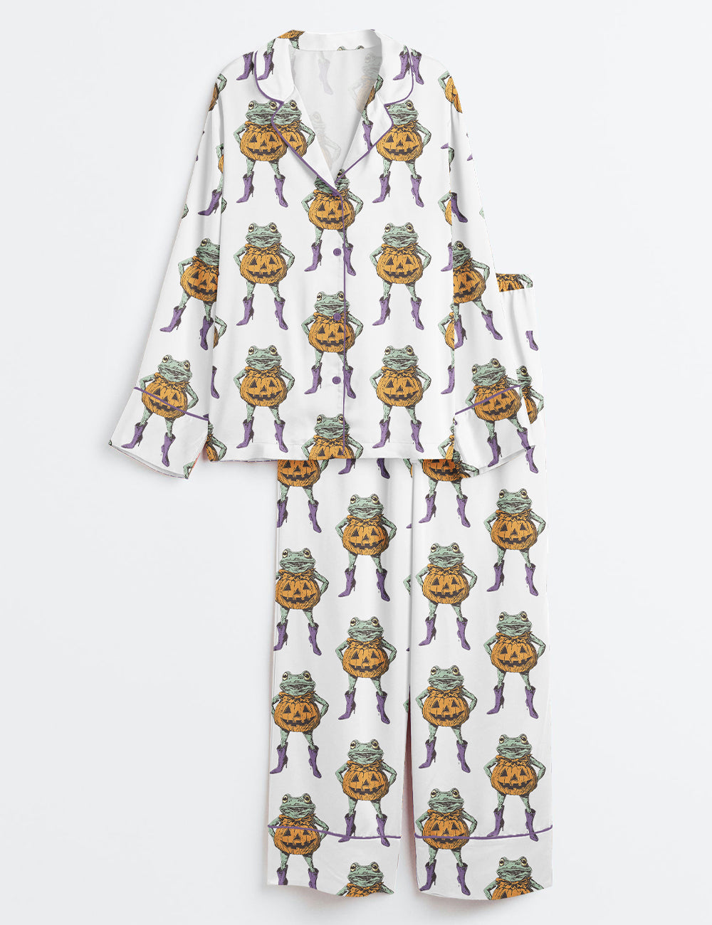 Women’s Frog In Pumpkin Costume Halloween Long Sleeve Satin Pajama Set