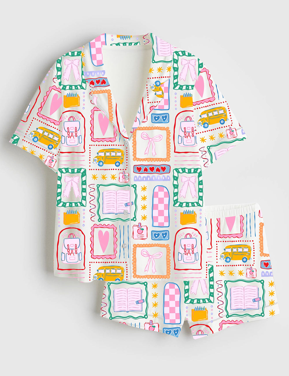 Women’s Girly Back To School Coquette Bows Preppy Girl Go To School Print Short Sleeve Satin Pajama Set