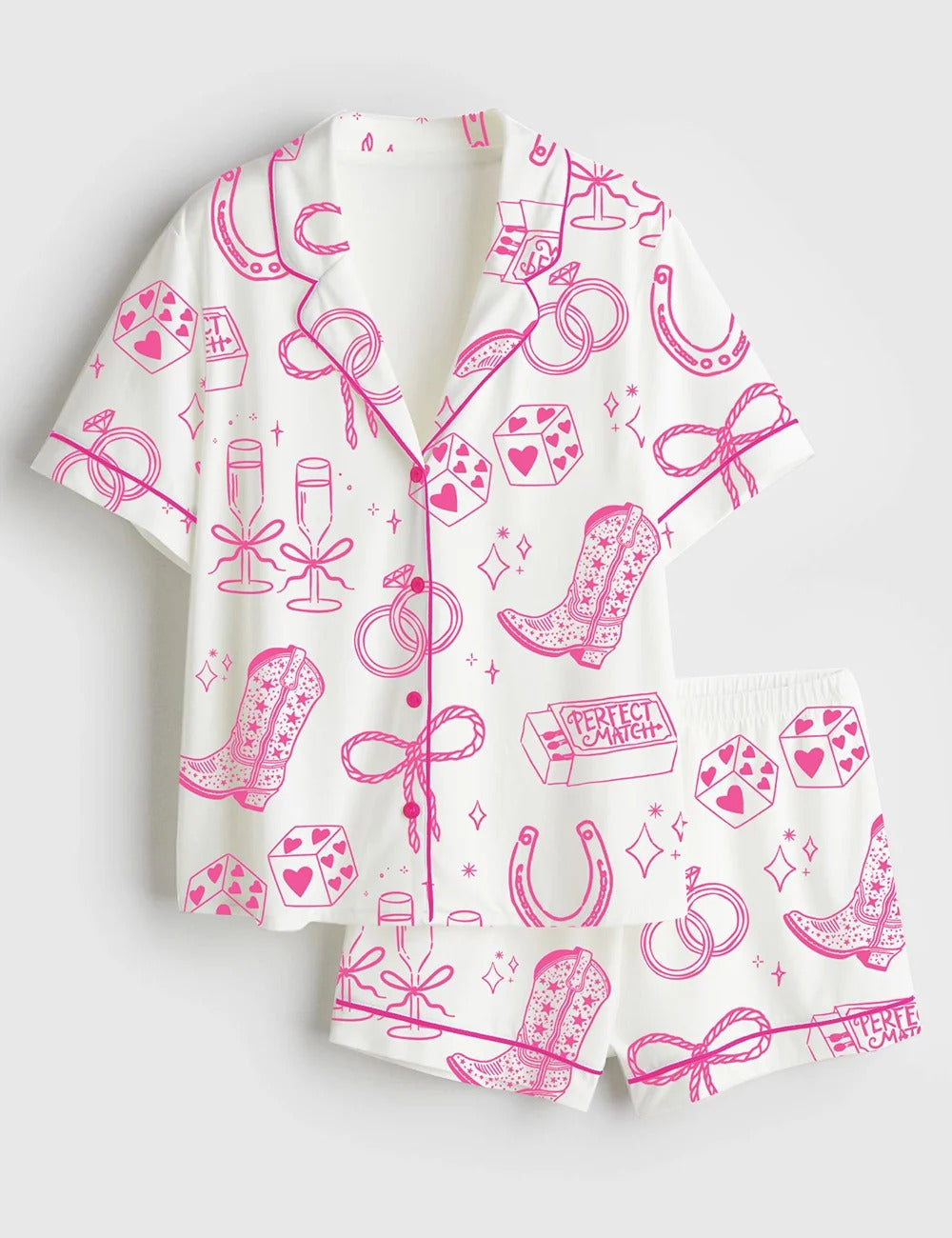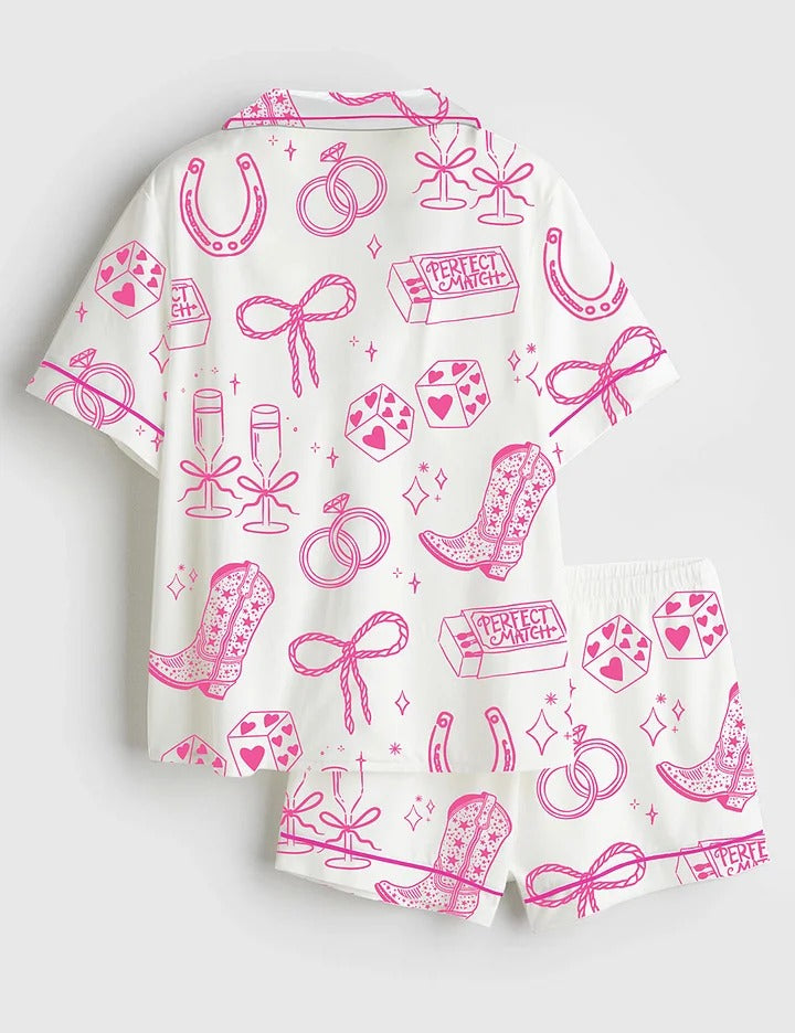 Women’s Going To The Chapel Cowgirl Bride Coquette Bridal Bow Floral Wedding Short Sleeve Satin Pajama Set