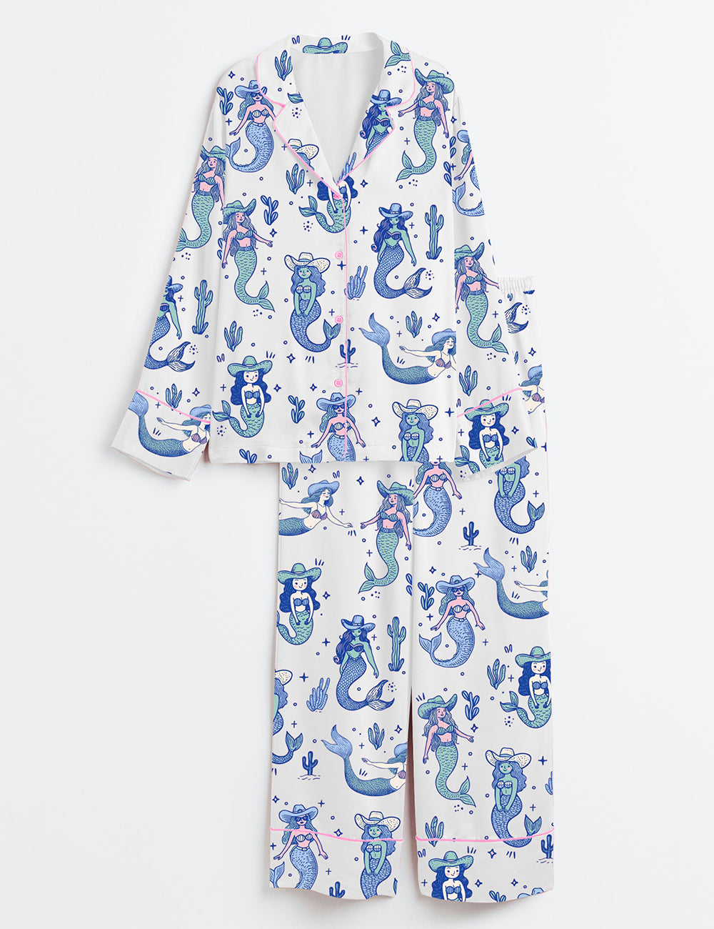 Women’s Mermaid Western Cowgirls Coastal Bachelorette Party Mermaid Print Long Sleeve Satin Pajama Set