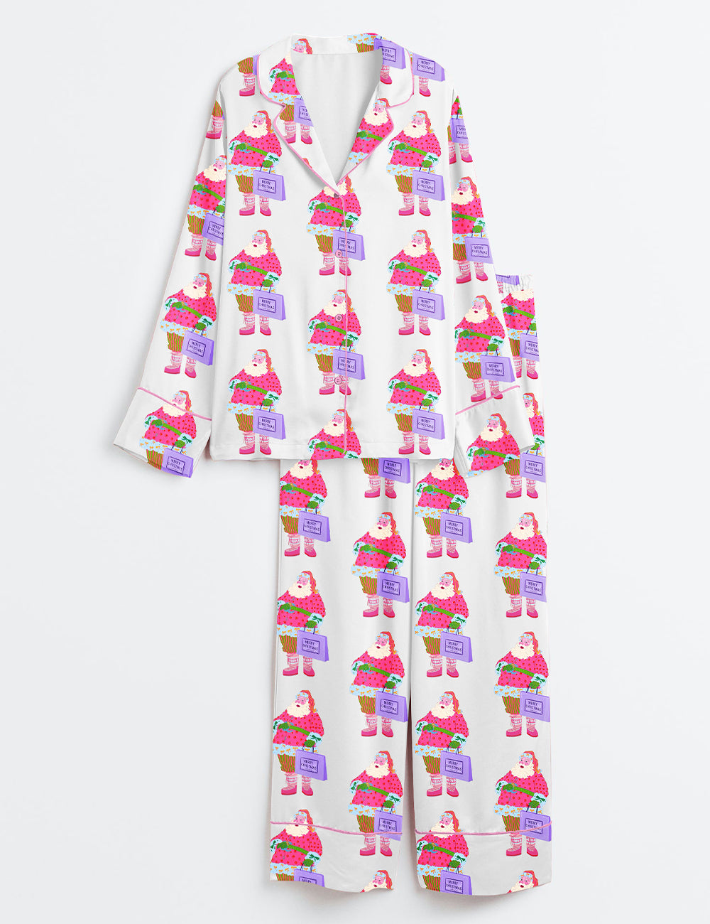 Women’s Pink Santa Shopping Merry Christmas Long Sleeve Satin Pajama Set