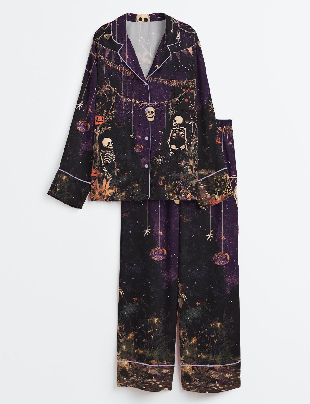 Women’s Pumpkin Skeleton Horror Scene Spooky Season Halloween Long Sleeve Satin Pajama Set