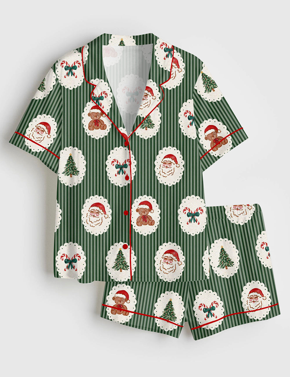 Women’s Red And Green Cameo Christmas Reindeer Gingerbread Bows Candy Cane Teddy Bears Short Sleeve Satin Pajama Set