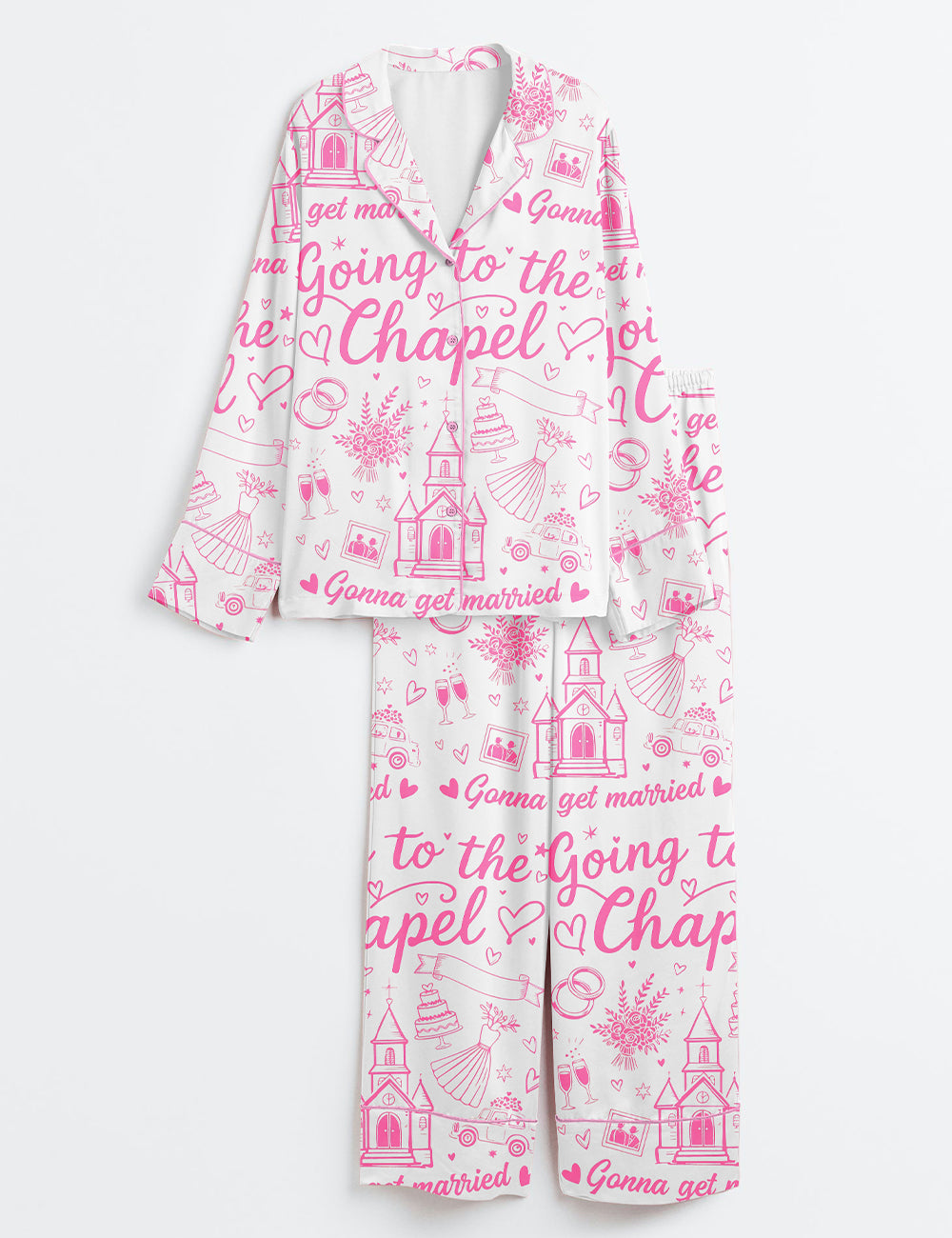 Women’s Retro Bachelorette Going To The Chapel Gonna Get Married Coquette Wedding Party Print Long Sleeve Satin Pajama Set